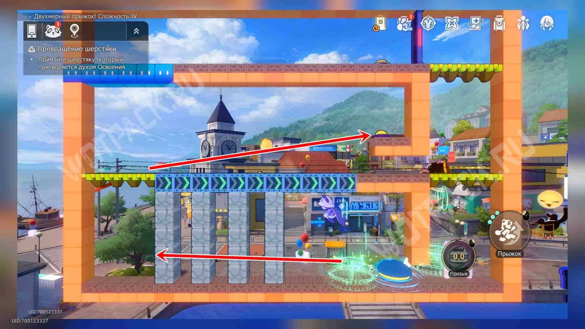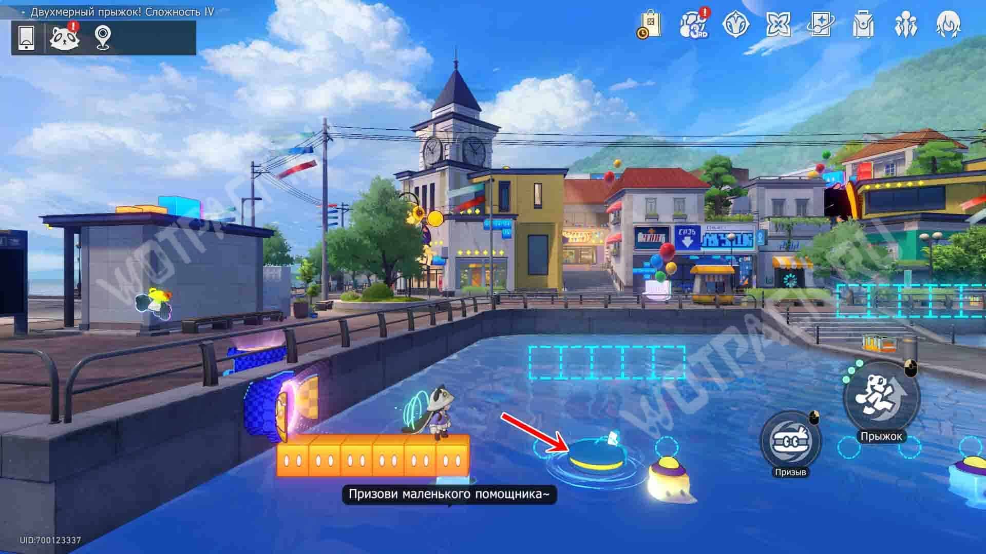Запускайте помощника, чтобы он нажимал кнопки и активировал платформы над водой. По ним доберитесь до портала, который расположен высоко над основной частью уровня.