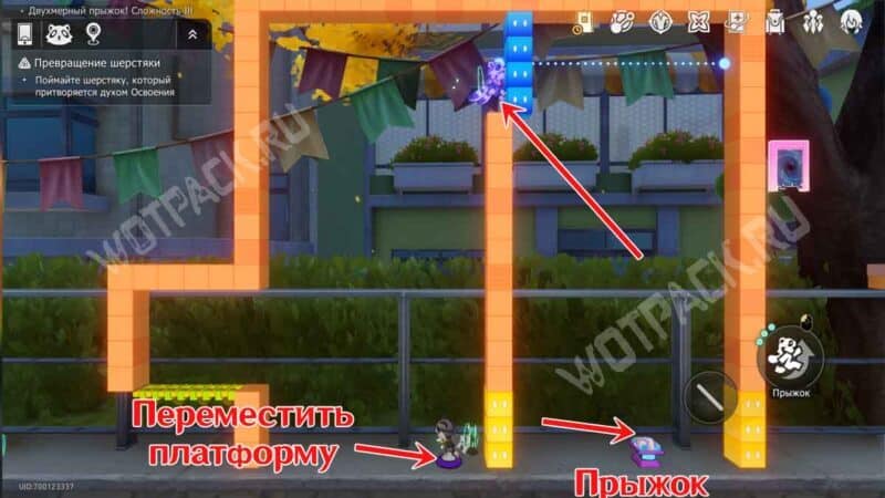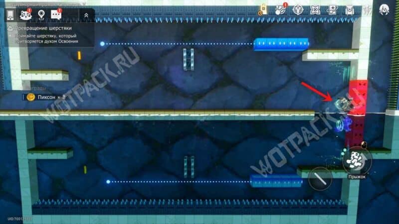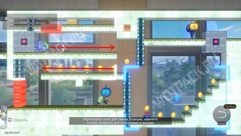 Преодолев платформы-котиков, сразу за стенкой из красных квадратов обнаружите шерстяку. Пространство с двойником нужно перенести: