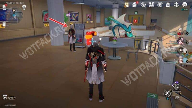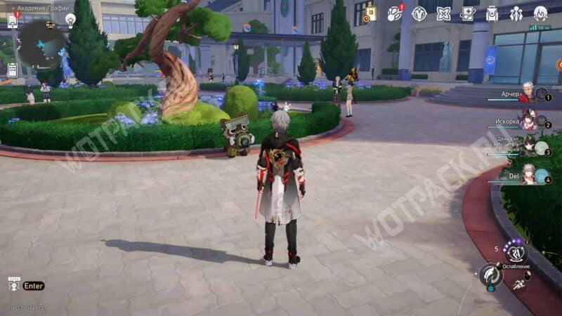 Рядом с точкой «Атриум академии» находится клумба с большим деревом. Со стороны входа в главный корпус сможете обнаружить енота. После недолгого разговора он спрячется.