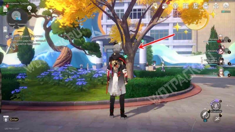 Подойдите к клумбе и попробуйте атаковать дерево с желтой листвой, которого ранее здесь не было.