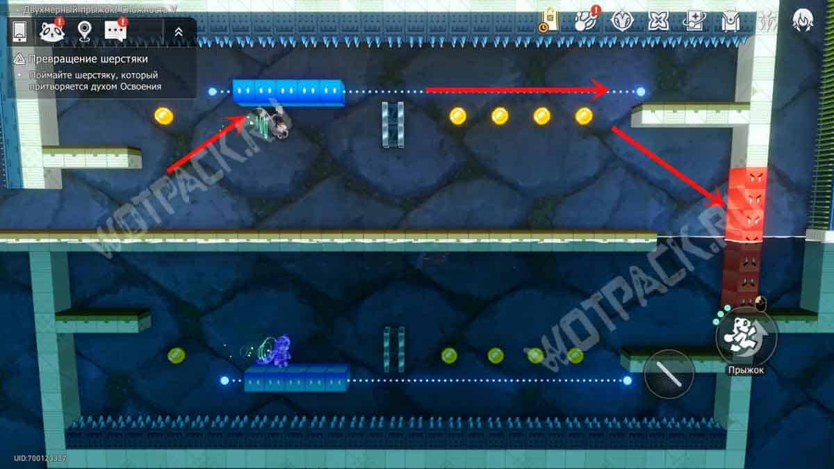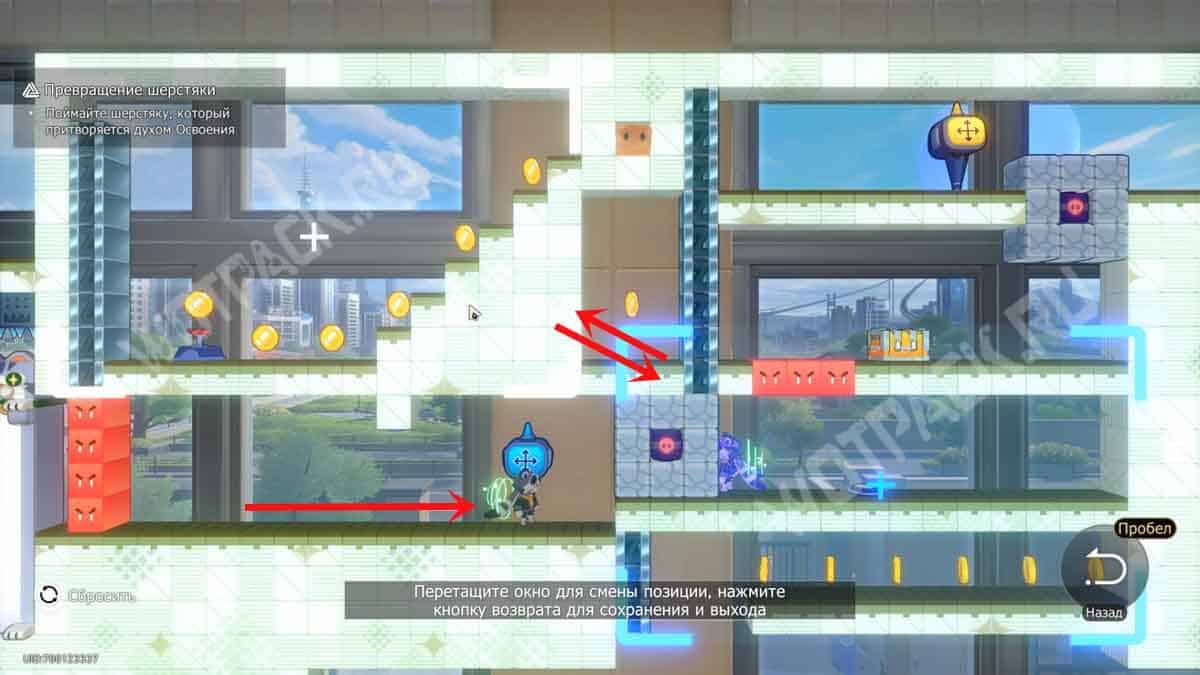 Преодолев платформы-котиков, сразу за стенкой из красных квадратов обнаружите шерстяку. Пространство с двойником нужно перенести: