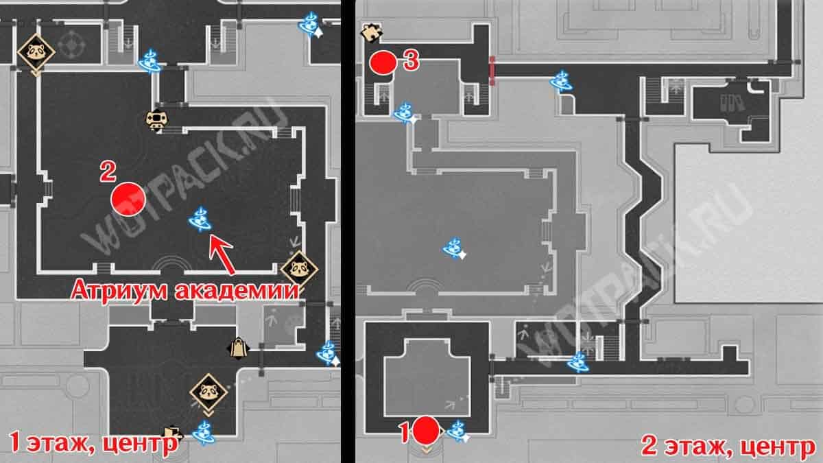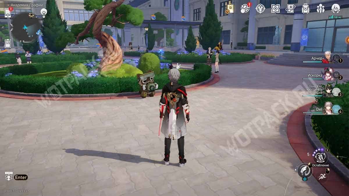 Рядом с точкой «Атриум академии» находится клумба с большим деревом. Со стороны входа в главный корпус сможете обнаружить енота. После недолгого разговора он спрячется.