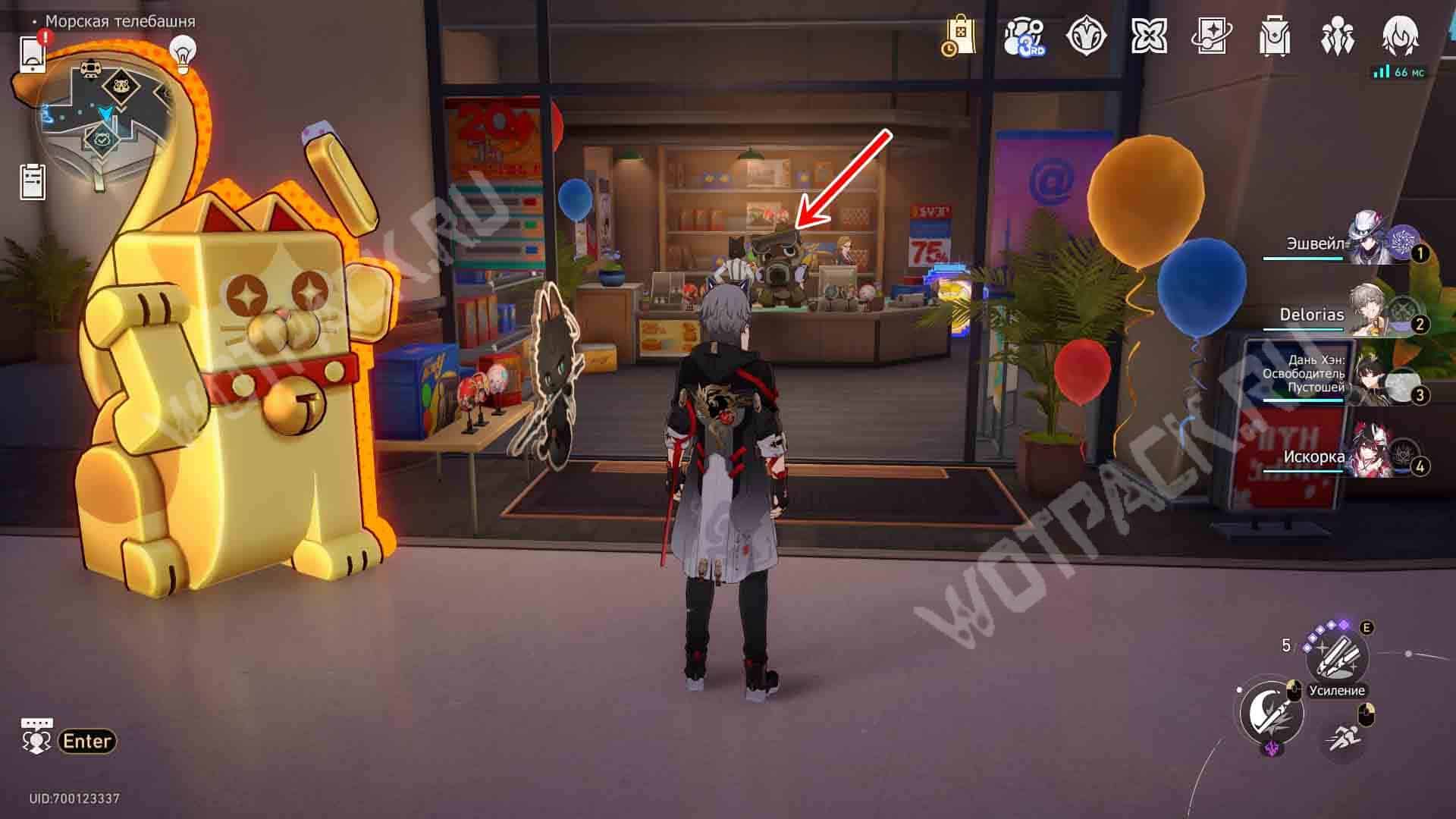 В магазине мерча на втором этаже подойдите и поговорите с пушистым бездельником.