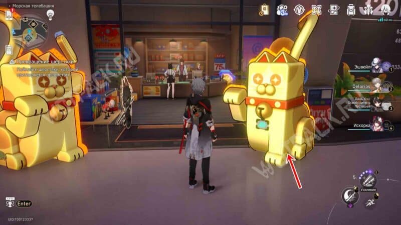 Испугавшись, он примет вид золотого кота на входе в лавку — ударьте по статуэтке, чтобы снять маскировку и схватить енота.