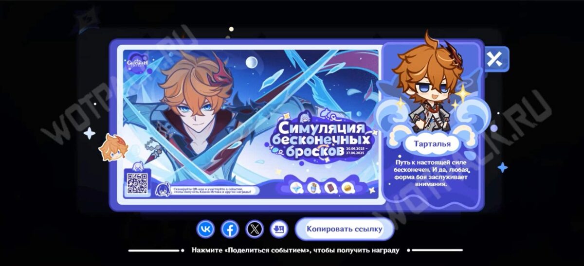 После начала активности ученица Грешника расскажет, что хочет найти вдохновение в других стилях сражения, и на помощь ей придет Тарталья. Поделитесь ссылкой через соцсети либо прямым копированием, чтобы разблокировать Предвестника Чайльда как боевую единицу и получить обои с ним.
