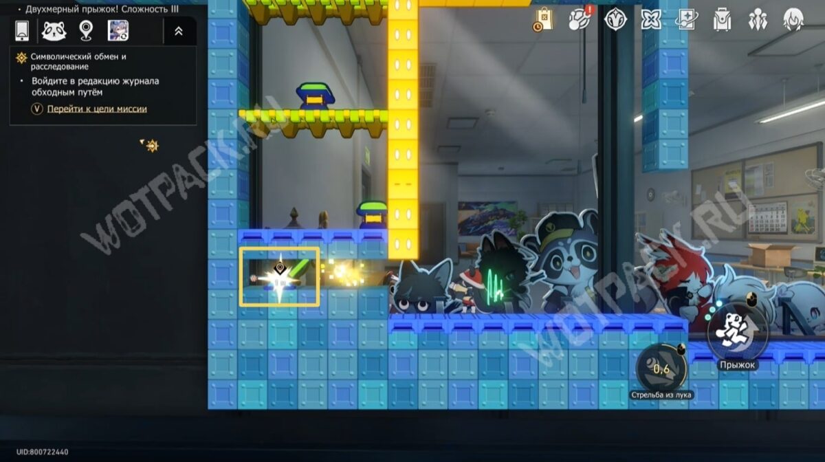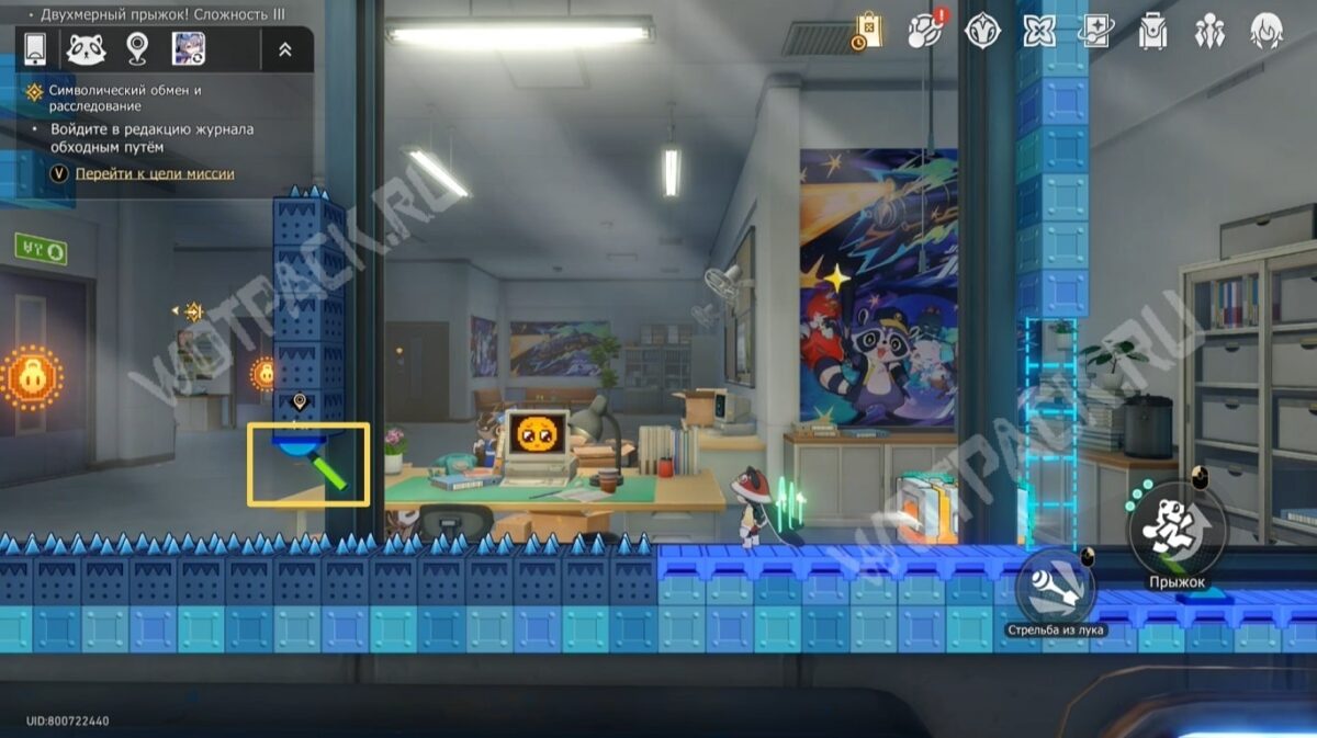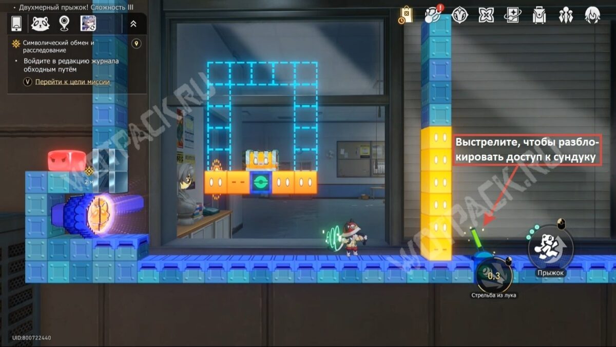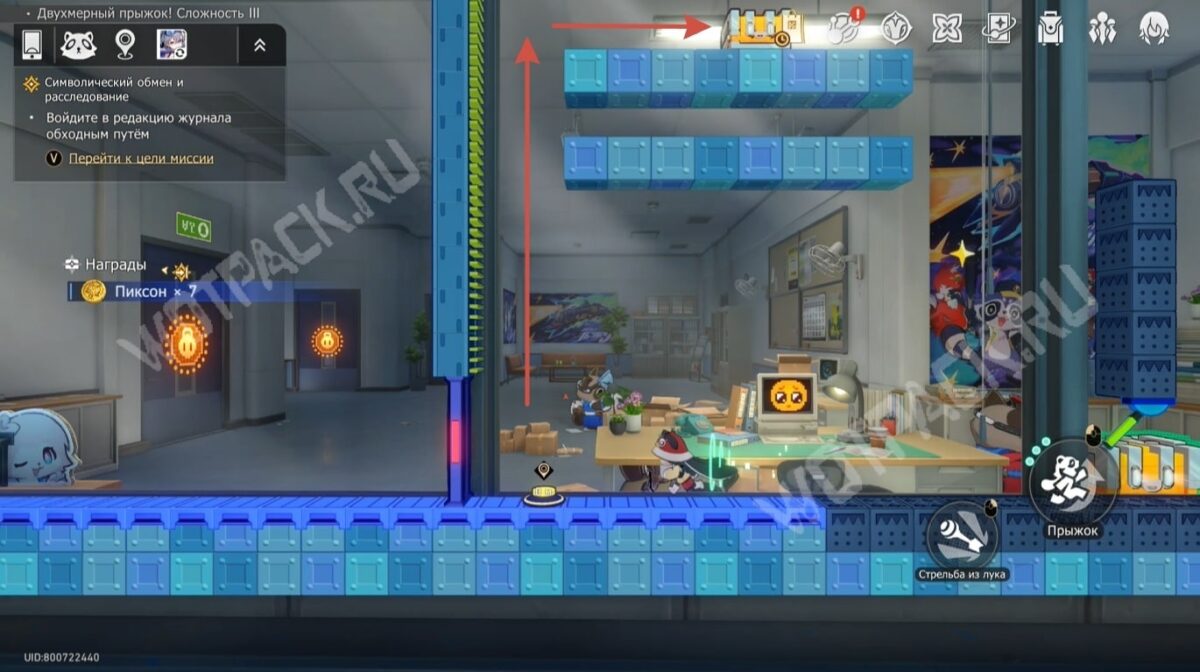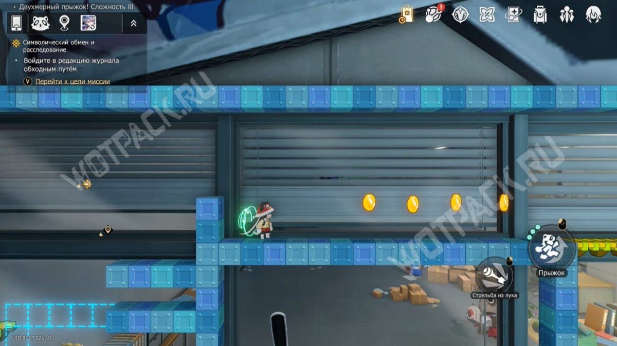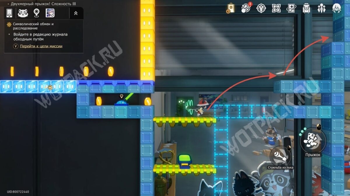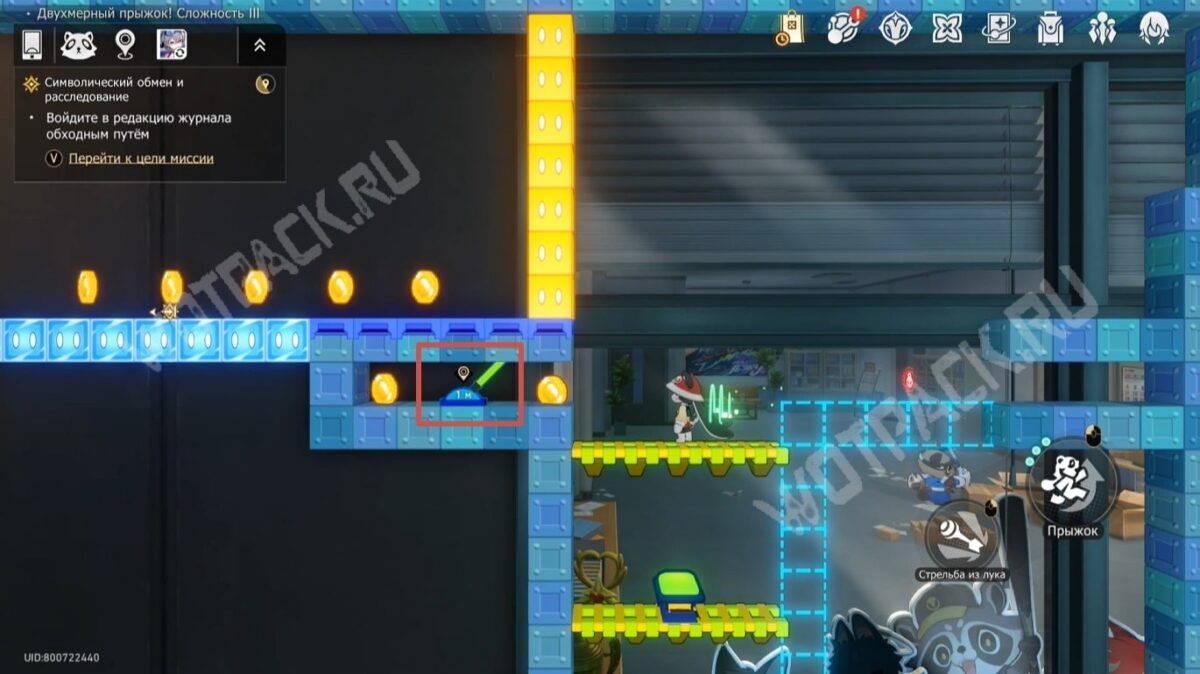- Добегите до кнопки, открывающей дальнейший проход. Если встанете на платформу сверху, то запустите испытание: соберите золотые монеты стрельбой из лука.