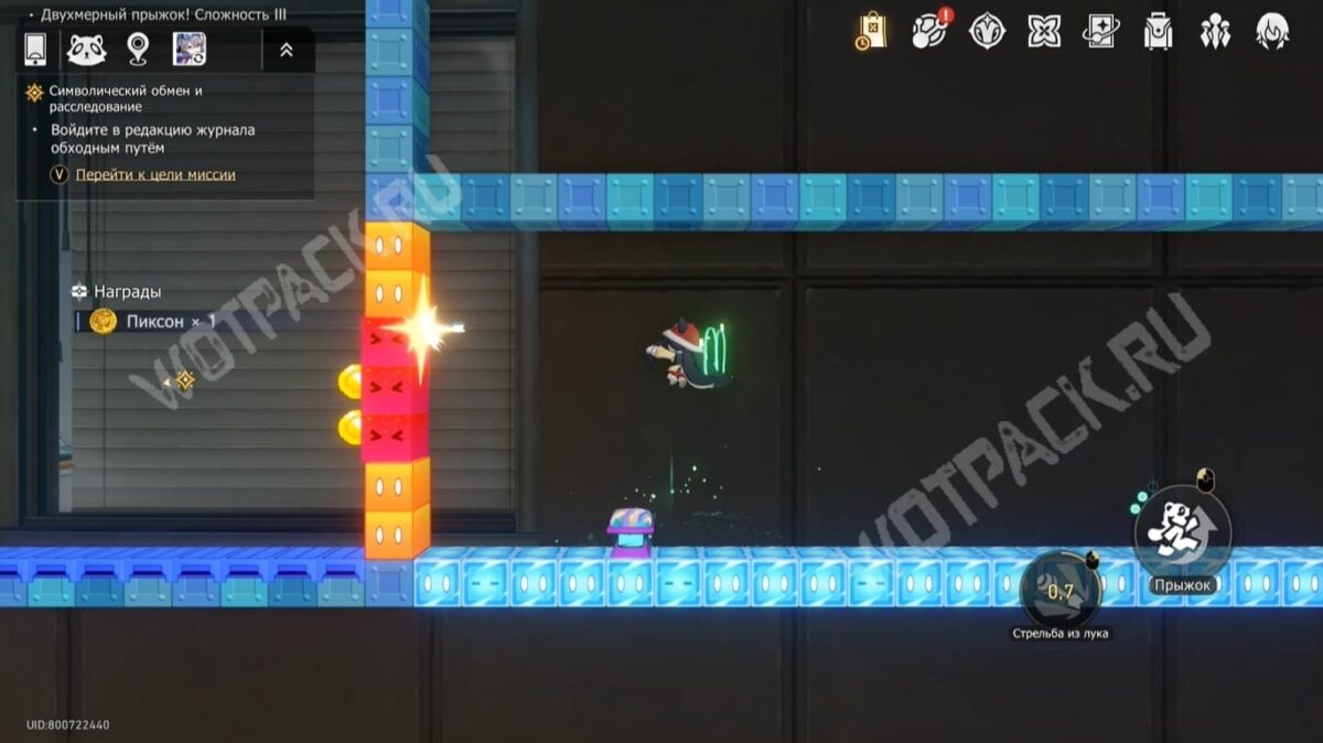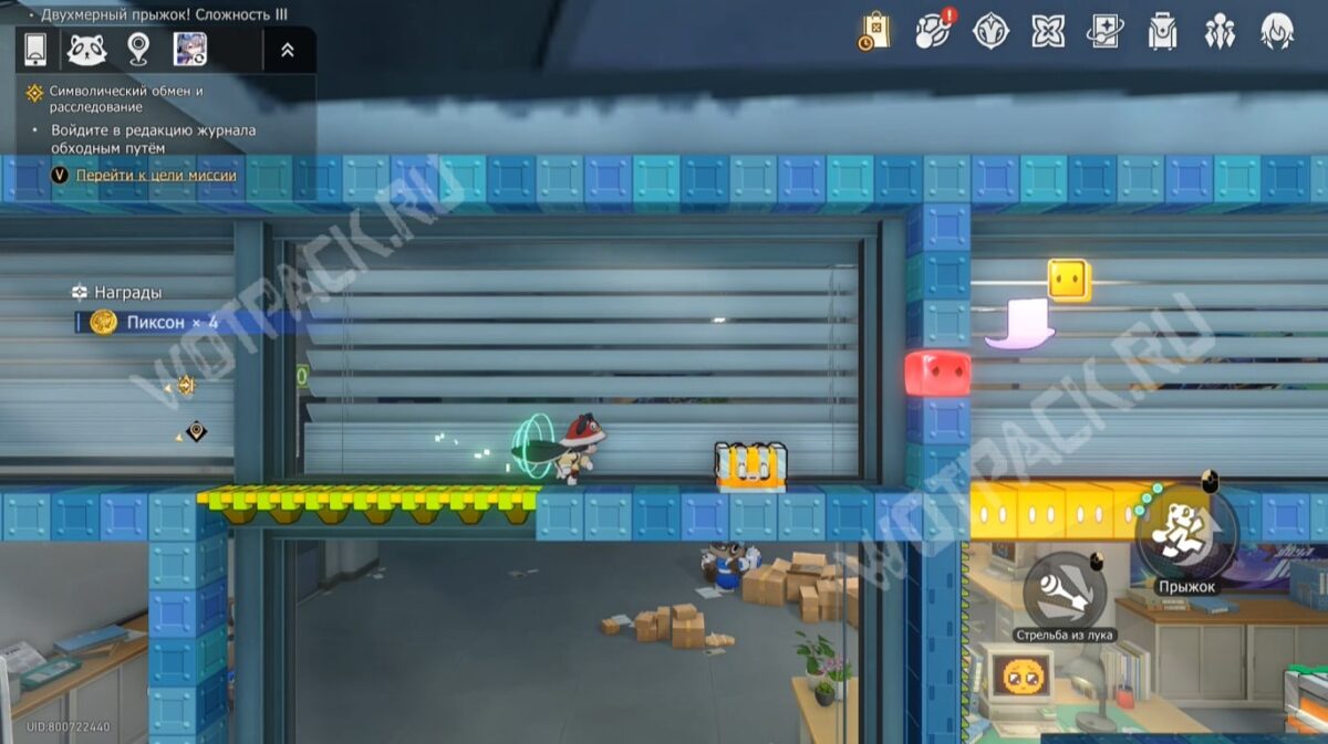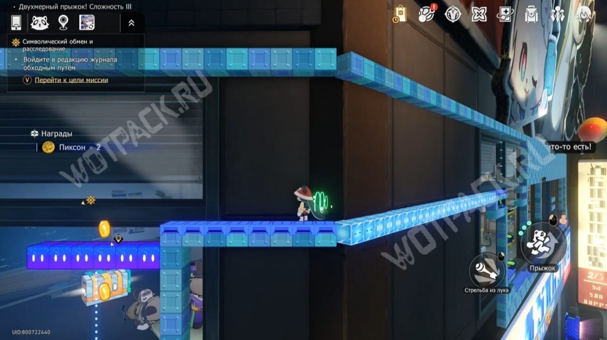 - При приближении к стенке синие блоки исчезнут. Здесь найдёте несколько пиксонов, обычный ящик и наклейку Безымянного эфемера.