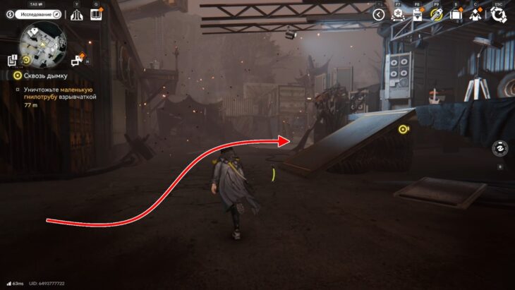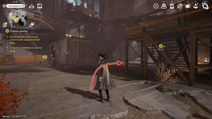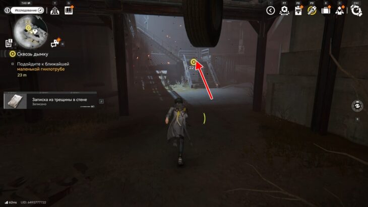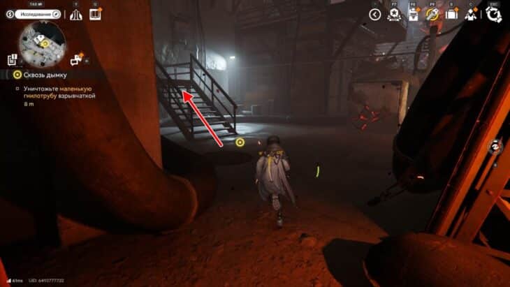 Стены из дымки ограничивают локацию и делают её коридорной, поэтому бегите вперёд, пока не доберётесь до лестницы. Поднимитесь по ней и увидите большую башню Землекрушителей. К ней тянется длинный красный шлейф от первой цели.