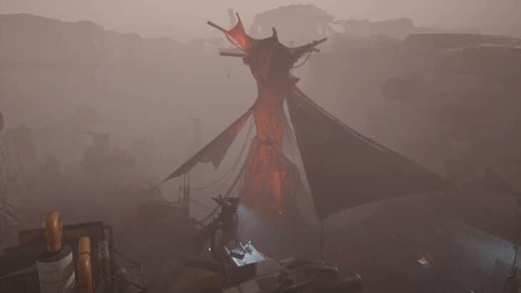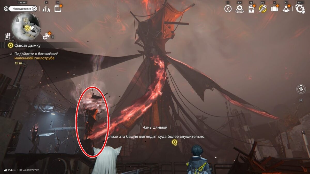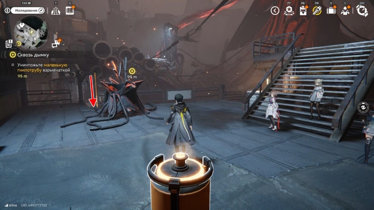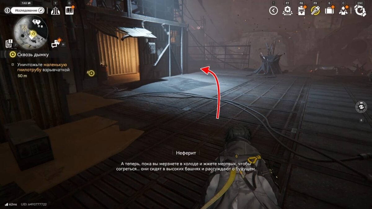 Стены из дымки ограничивают локацию и делают её коридорной, поэтому бегите вперёд, пока не доберётесь до лестницы. Поднимитесь по ней и увидите большую башню Землекрушителей. К ней тянется длинный красный шлейф от первой цели.
