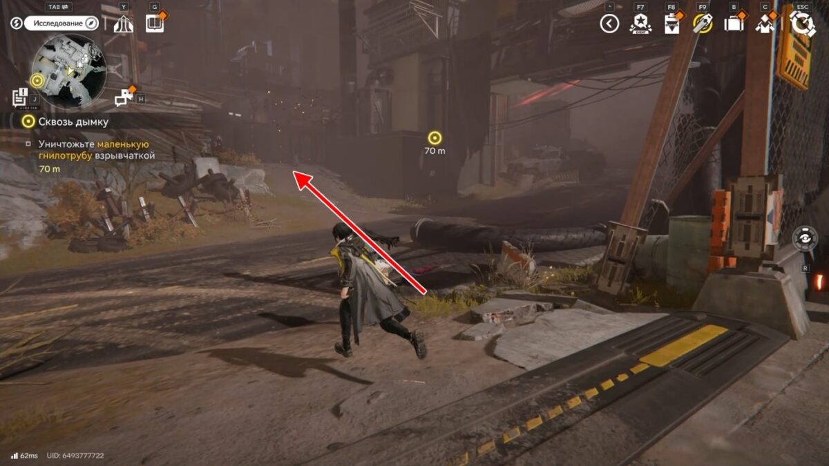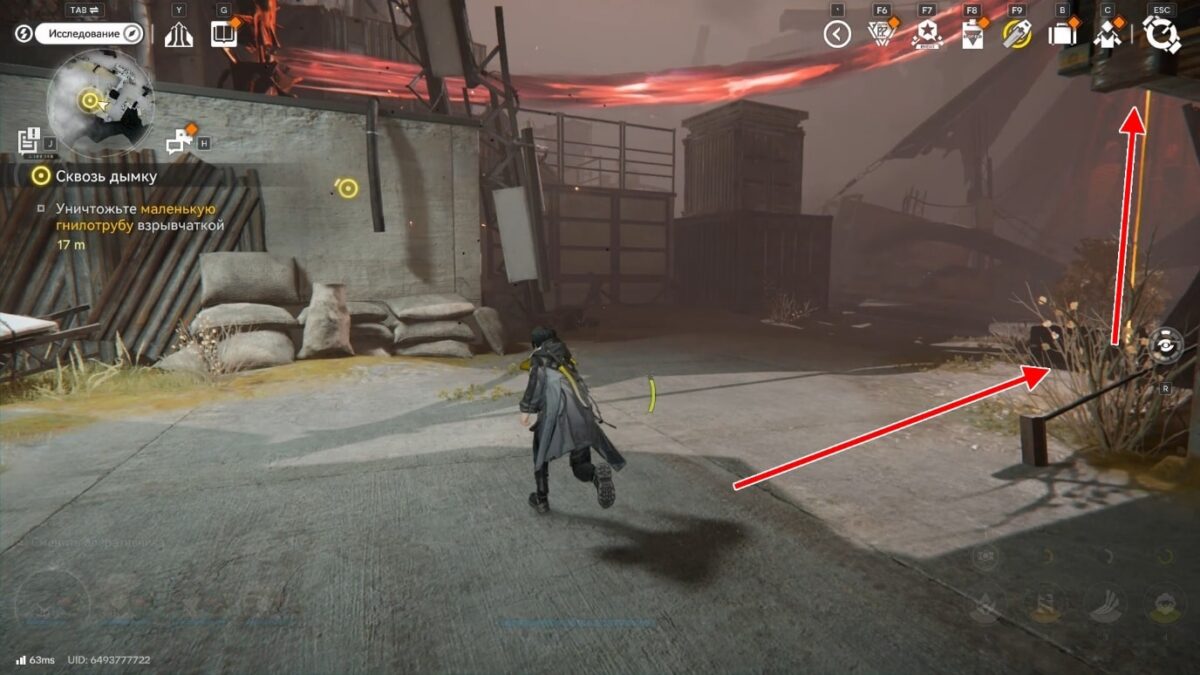 Используйте вертикальный зиплайн за сломанной трубой, чтобы спуститься на землю, и бегите на юго-восток.