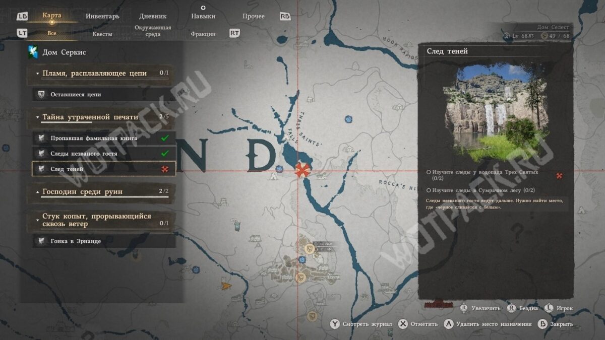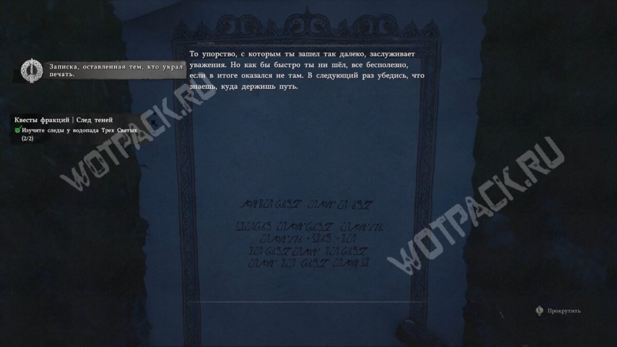 След теней — третье задание из серии «Тайна утраченной печати» в Crimson Desert, в котором предстоит продолжить поиски вора, укравшего реликвию у маркиза. Найденные улики указали на новое место — «где чёрное и белое пребывают в гармонии». Заказчик предполагает, что это могут быть необычные руины в Сумрачном лесу. Отправляйтесь к ориентиру, а по пути посетите водопад Трёх Святых, где тоже могут обнаружиться зацепки.
