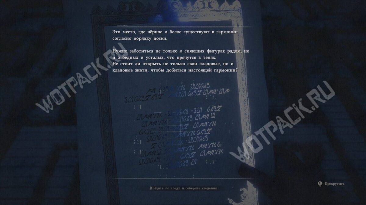 Оказавшись на поле с каменными шашками, используйте фонарь, чтобы посветить в центр площадки. Ищите белый камень, над которым вьётся чёрная дымка. Поднимите его — и найдёте новое письмо и дощечку с надписью.