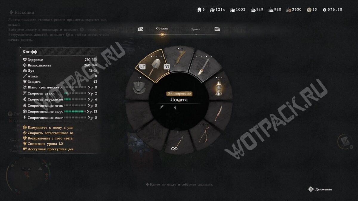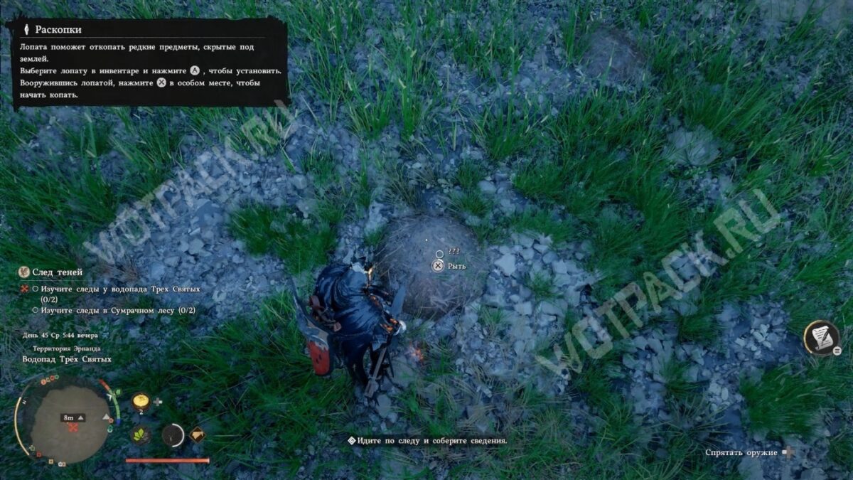 Экипируйте лопату в быстрый слот двуручного оружия через радиальное меню или инвентарь. Подойдите к вскопанной земле и используйте действие «Рыть».