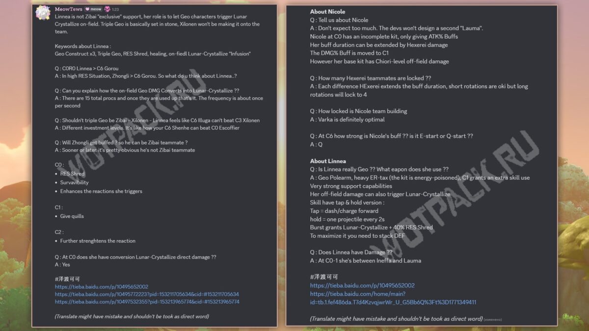 Ранее на китайском форуме tieba пользователи 少废话 и 你DPS多少 уже делились слухами о геймплее альва Линнеи, а теперь другой инсайдер под ником 泽渡可可 решил рассказать про её способности и отряды в Genshin Impact. Он заявил, что зоолог владеет копьем, требует очень много восстановления энергии и не является эксклюзивным саппортом для Адепта Цзы Бай — напротив, в первую очередь она создана для других персонажей, чтобы помогать им вызывать реакцию Лунного кристалла.