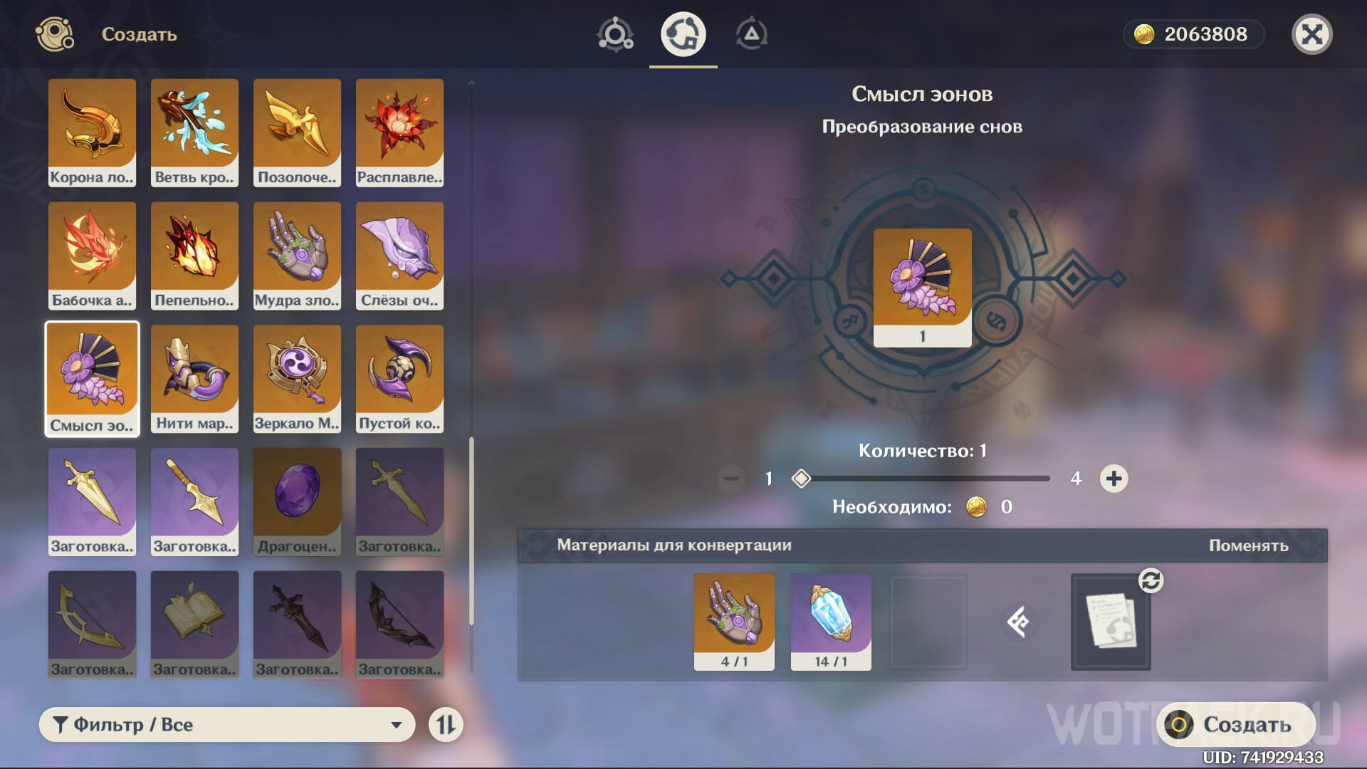 Помимо этого Смысл эонов можно создать самостоятельно при помощи алхимии. На любом алхимическом столе нужный материал крафтится при помощи Растворителя снов из Мудры зловещего генерала или Слезы очищения божества бедствий.