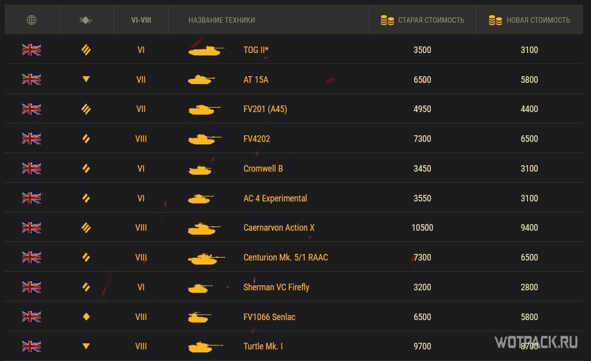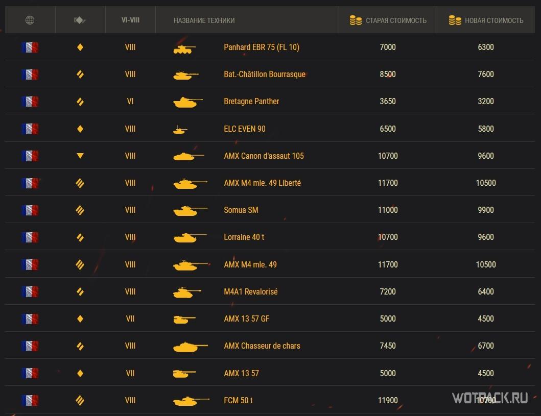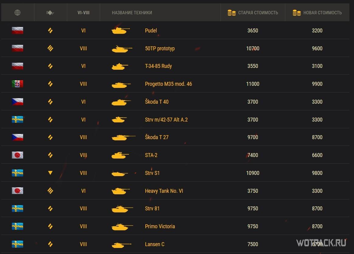 В таблице можете посмотреть обновленную стоимость премиумной техники в WoT. Внимательные игроки, которые дружат с математикой, могли заметить, что в некоторых случаях цена снизилась больше, чем на 10%.
