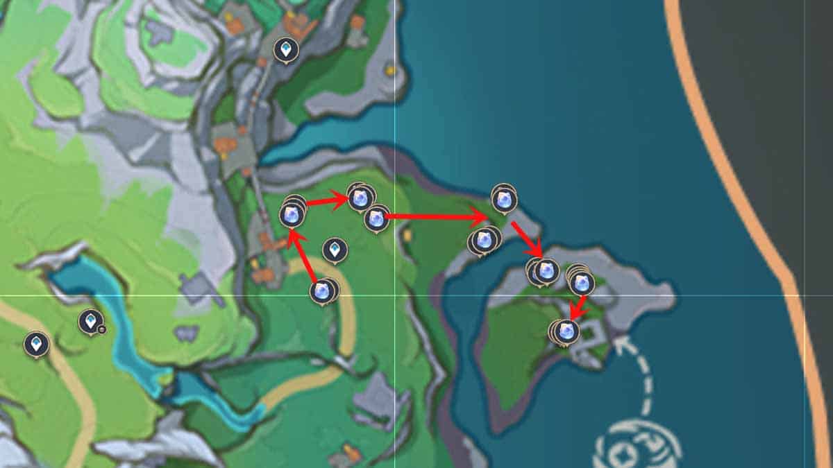 Начните свой путь с перехода от основного материка на сушу, двигайтесь на часовой стрелке среди деревьев и завершите сбор за статуей хорька барахольщика.