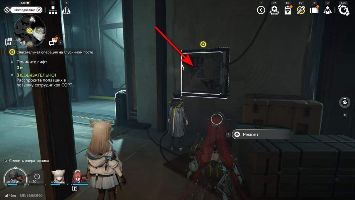 Застрявшие люди расскажут, что анкер при падении сломал дополнительный лифт, поэтому они не смогли выбраться. Для дополнительных сведений при желании можно расспросить попавших в ловушку сотрудников СОРТ. Чтобы починить подъемник, взаимодействуйте с панелью на стене и решите небольшую головоломку по установке модулей.