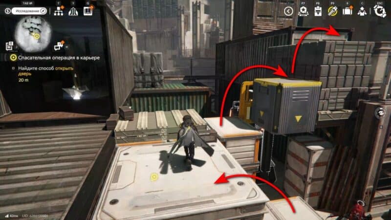 Справа от двери пройдите через контейнер или вскарабкайтесь наверх по ящикам — за ними увидите вилочный погрузчик. Воспользуйтесь им, чтобы поднять одну из коробок выше.