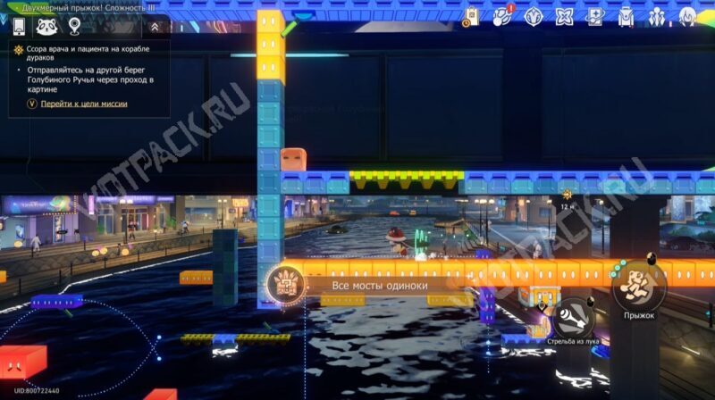 Аналогичные действия проделайте к фиолетовому блоку эфемера, чтобы расширить область, на которой сможете стоять. С её помощью доберётесь до заветного места.