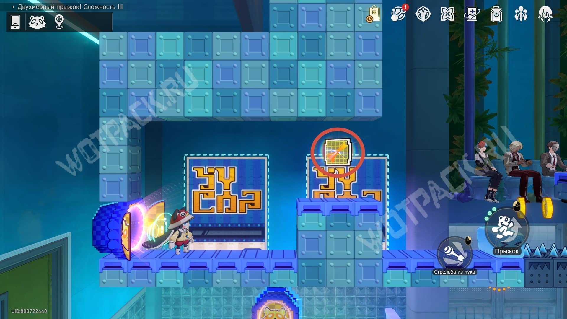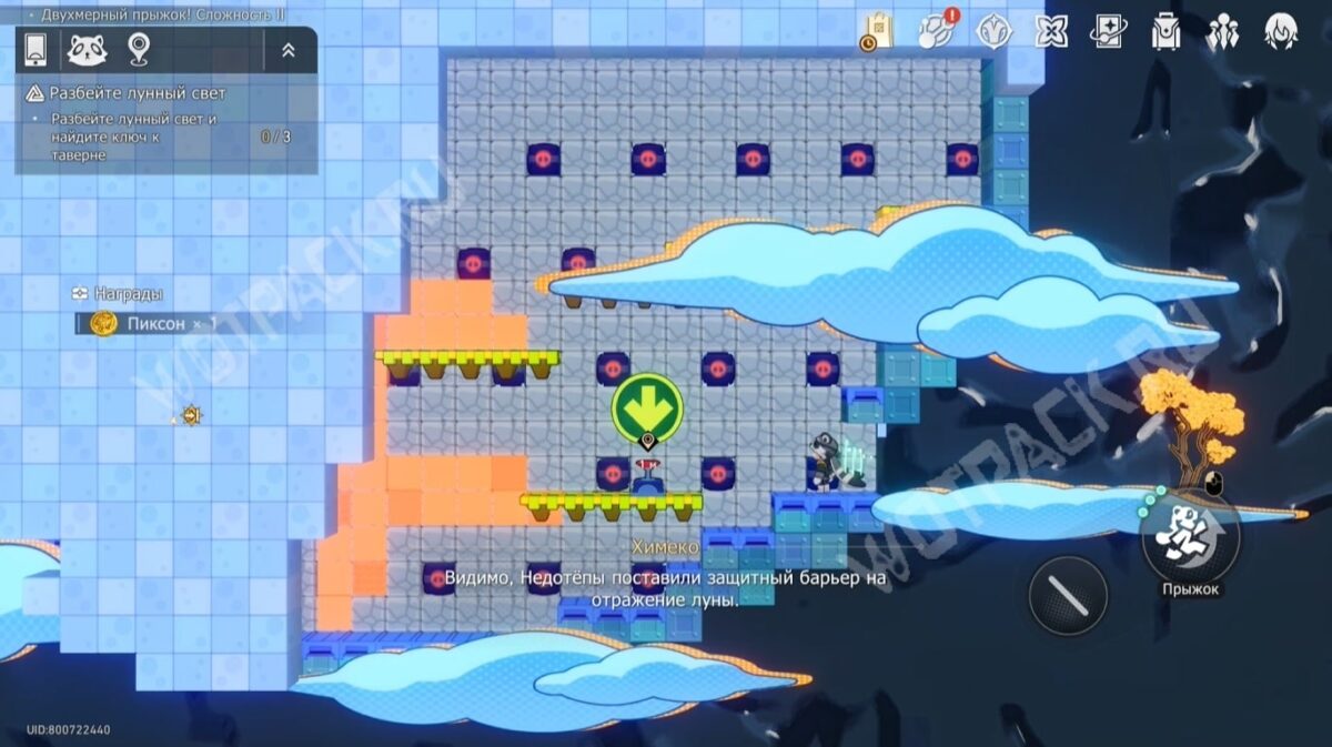 Аналогичные действия проделайте к фиолетовому блоку эфемера, чтобы расширить область, на которой сможете стоять. С её помощью доберётесь до заветного места.