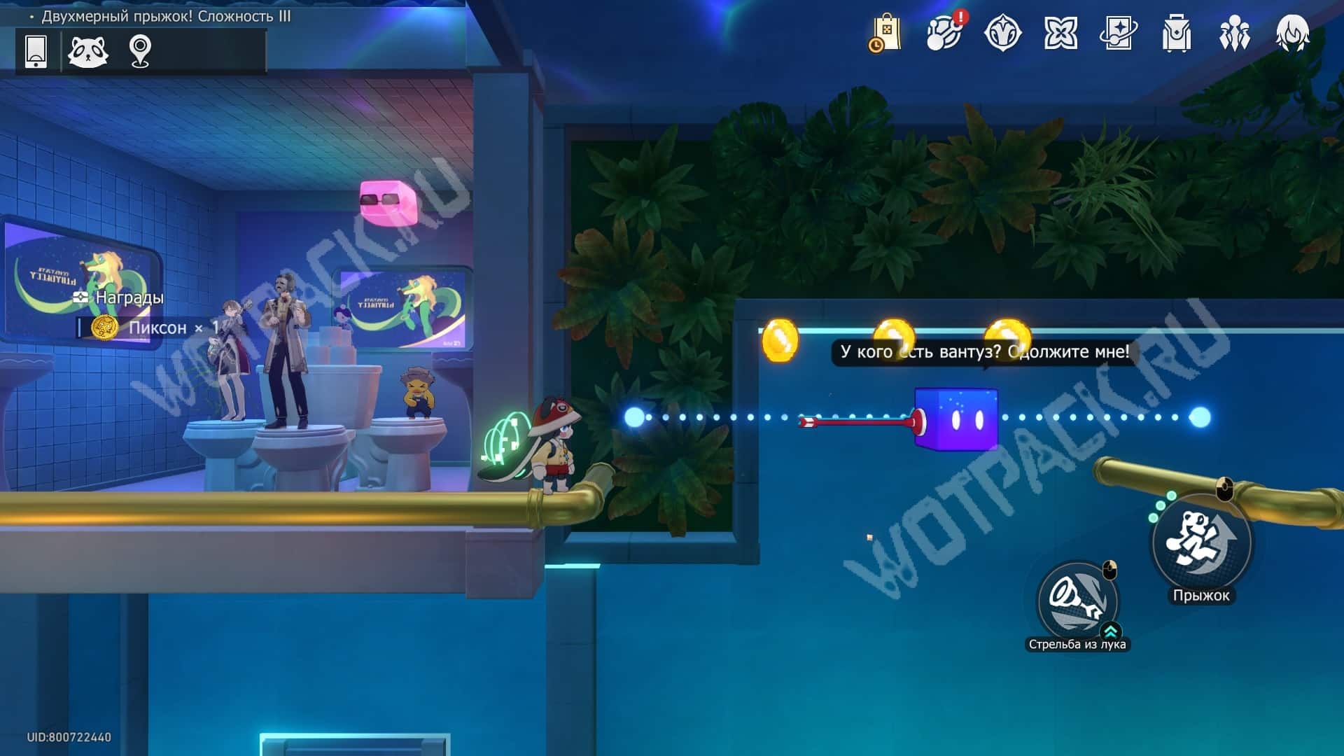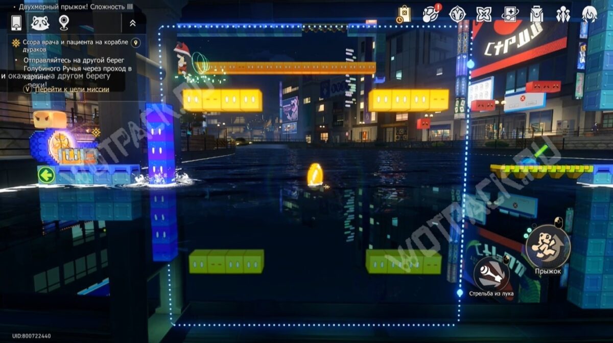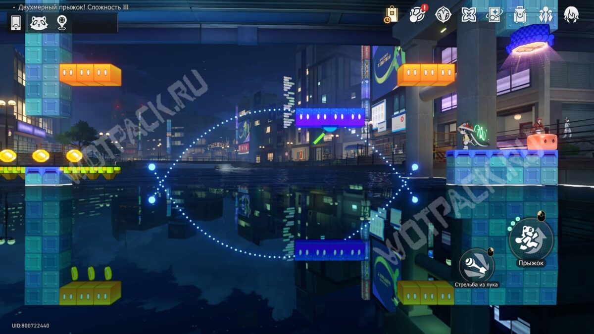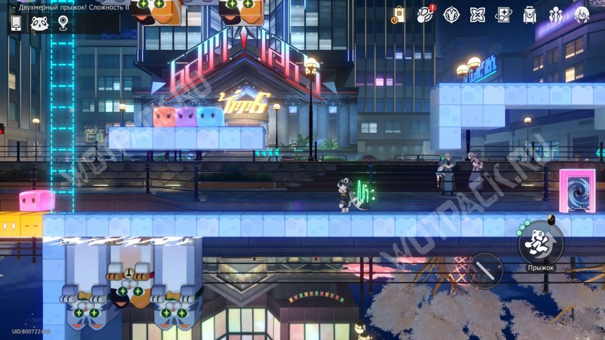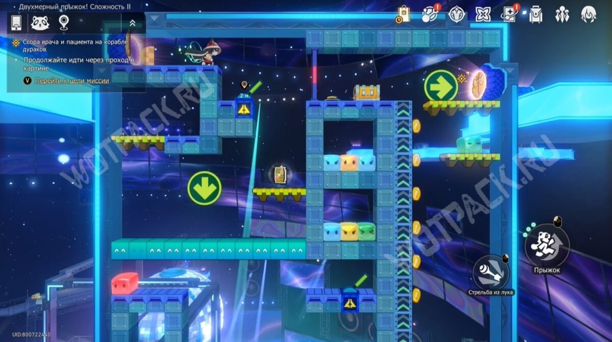 Телепортировавшись в «Двухмерный прыжок! Сложность 2» и соберите золотые монеты по дорожке до телепорта.