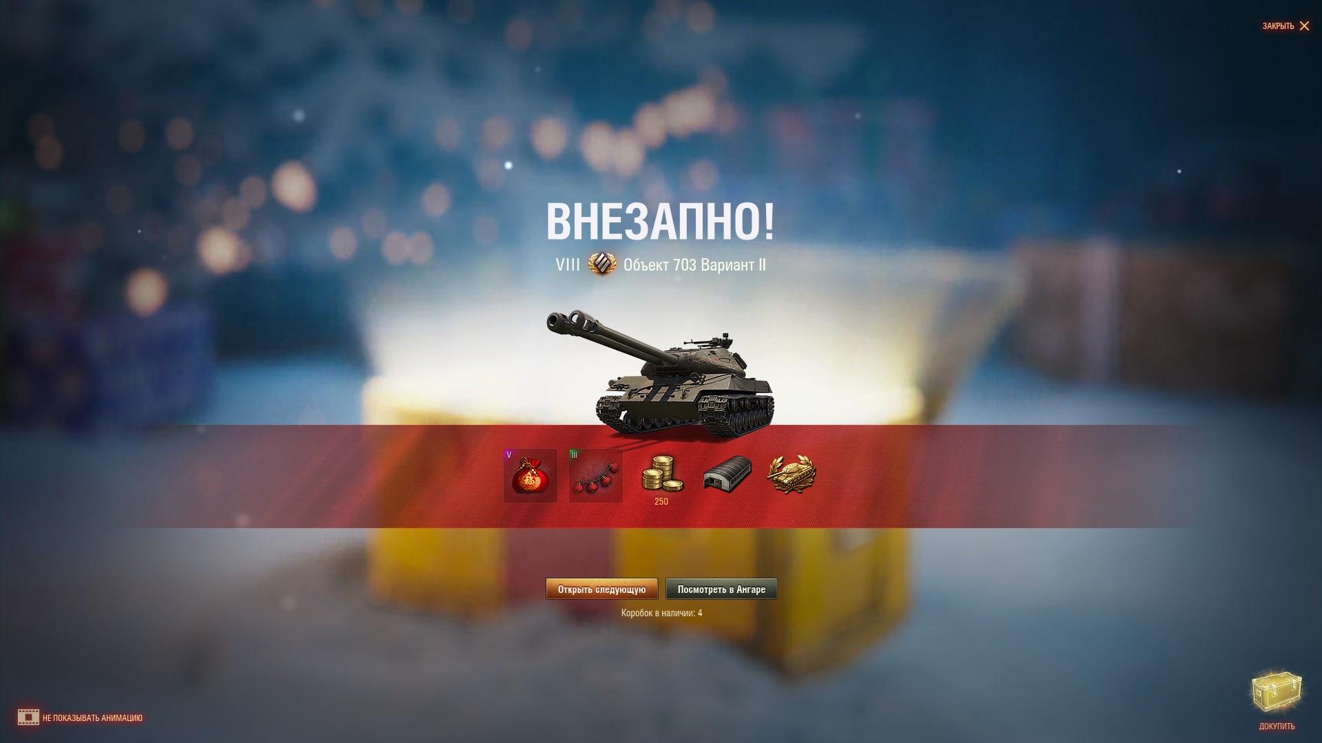 Вдохновленные дропом и немного огорченные, что вытащили все, кроме двухпушечного танка Объект 703 Вариант II мы решили вечерком докупить еще 5 коробок (выбрали Восточные, т.к. оттуда уже достали две «восьмерки»). Учитывая рандом, особых надежд не питали, но он все же выпал! С первой же коробки к нам выехал Об. 703 II (122).