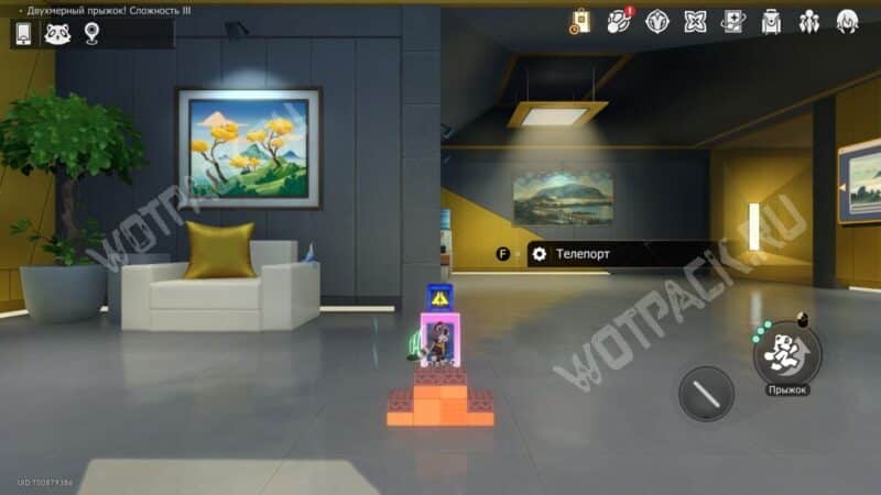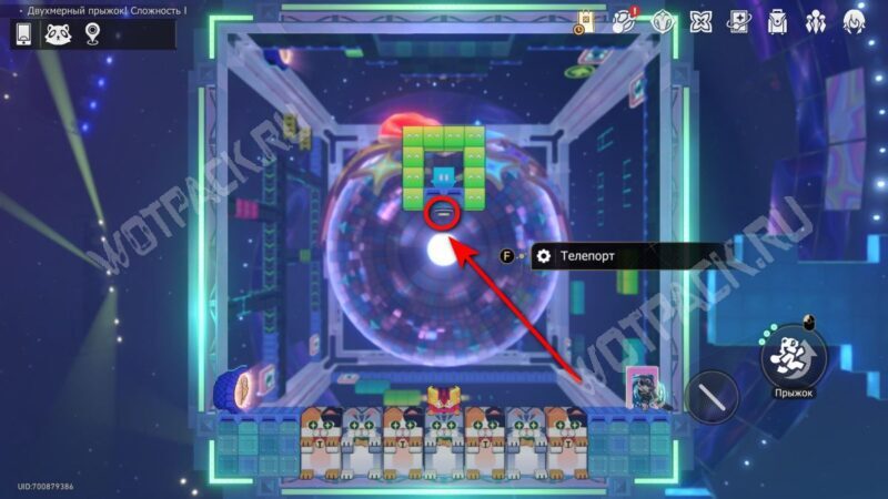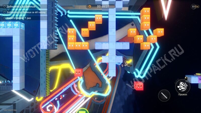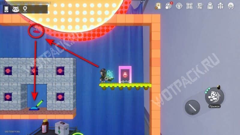 Далее находится заблокированный портал — откройте его с помощью кнопки рядом, до которой можно добраться с помощью батута. Перейдя по этому телепорту, поверните налево и снова переместитесь через врата с желтым значком.