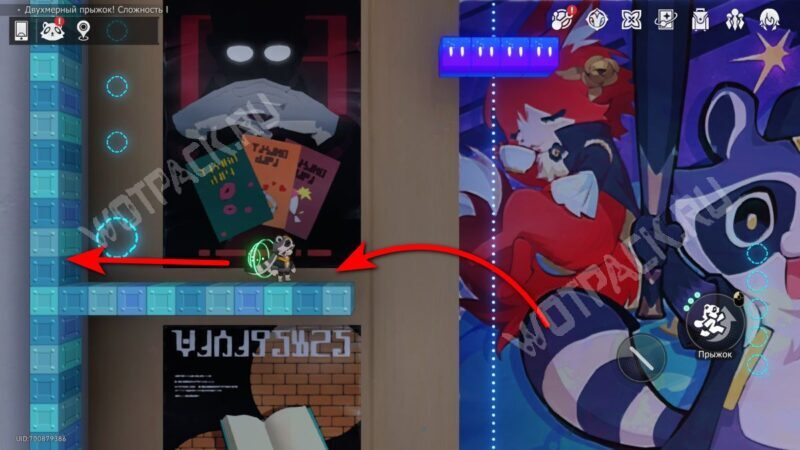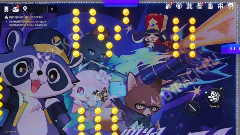 Внутри мини-игры находится рисунок с персонажами «Пушистого скитальца». С помощью движущейся платформы обогните его и обратите внимание на римские цифры из монеток, которые отмечают каждого персонажа. Именно в таком порядке их изображения нужно искать по другим 2D-уровням для получения подсказок: