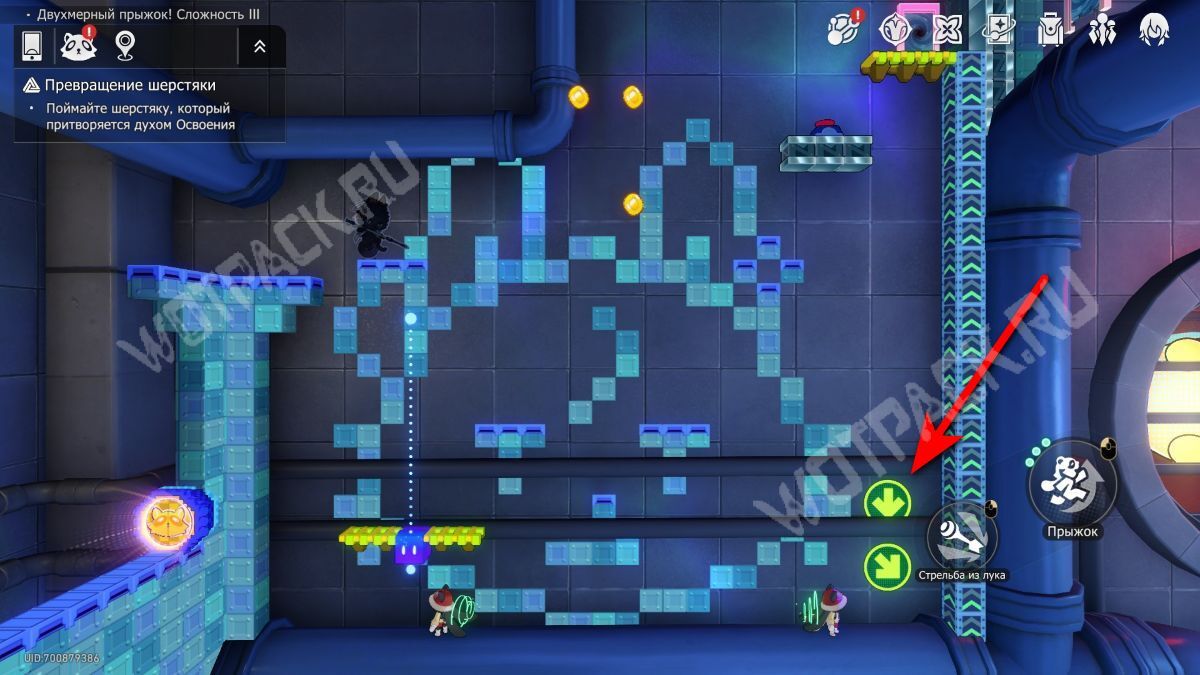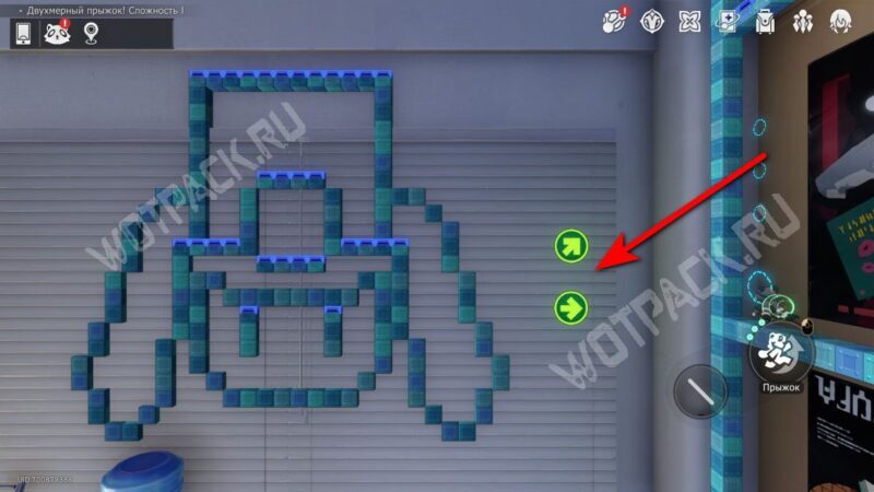 Полностью пройдите испытание и перед трубой-выходом запрыгните наверх, где увидите загадку с Шерстяными товарами и последние стрелочки — «↓ ↘».