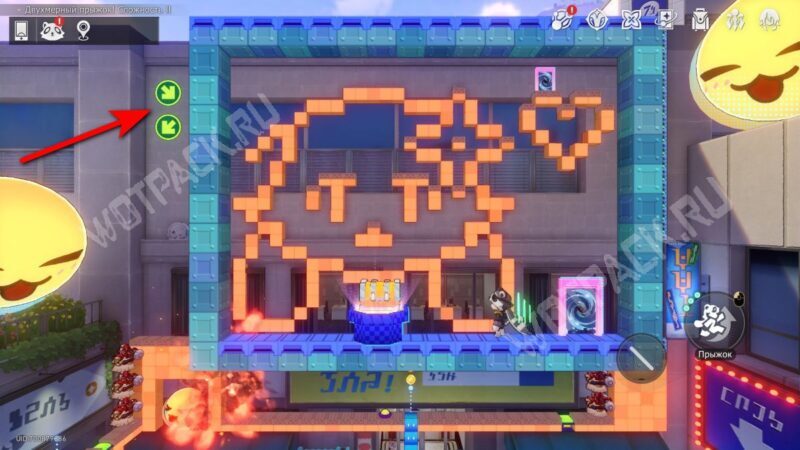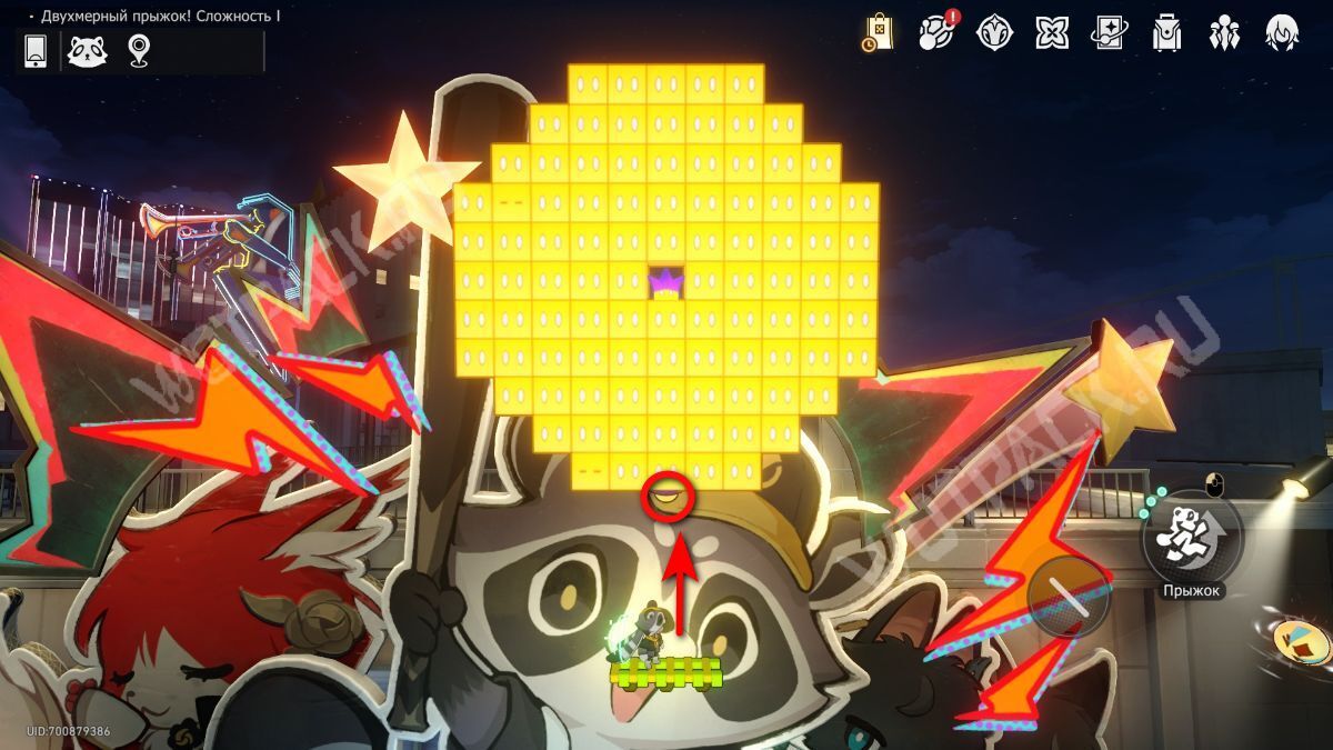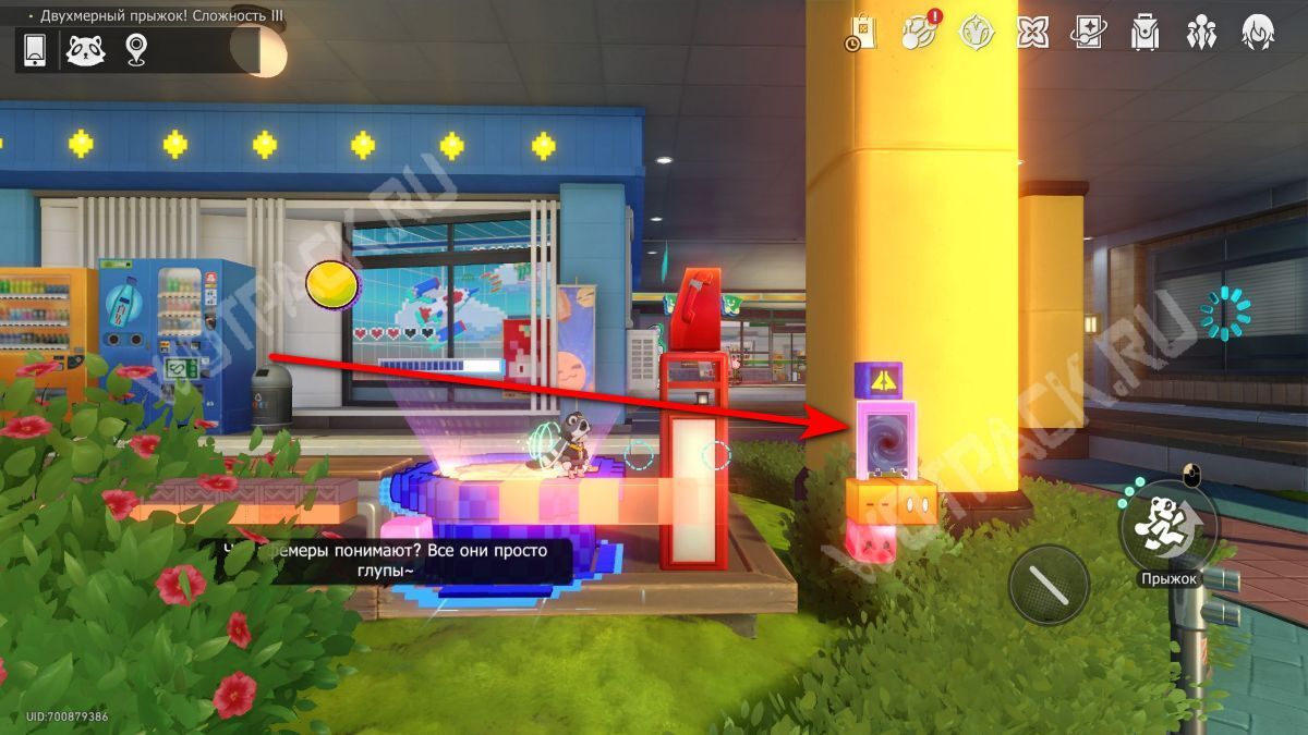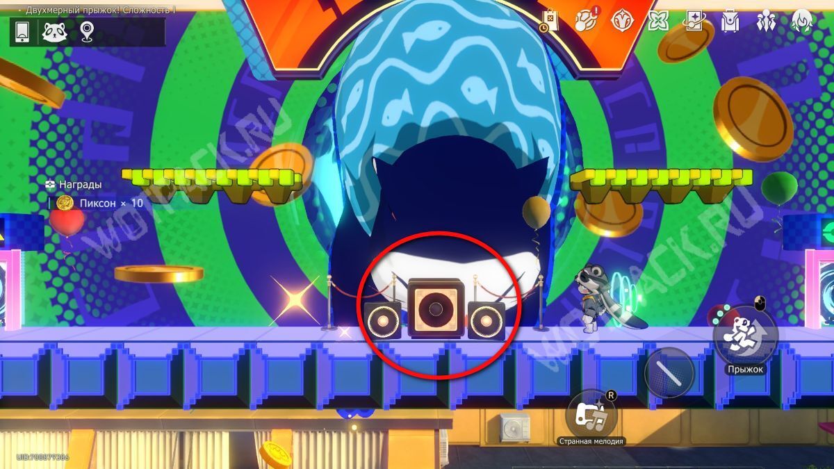 Перейдите на «@Площадь развлечений» и осмотрите восточную зону у кафе и киосков — внутри «Двухмерный прыжок! Сложность III» находится ещё один уровень с колонками.