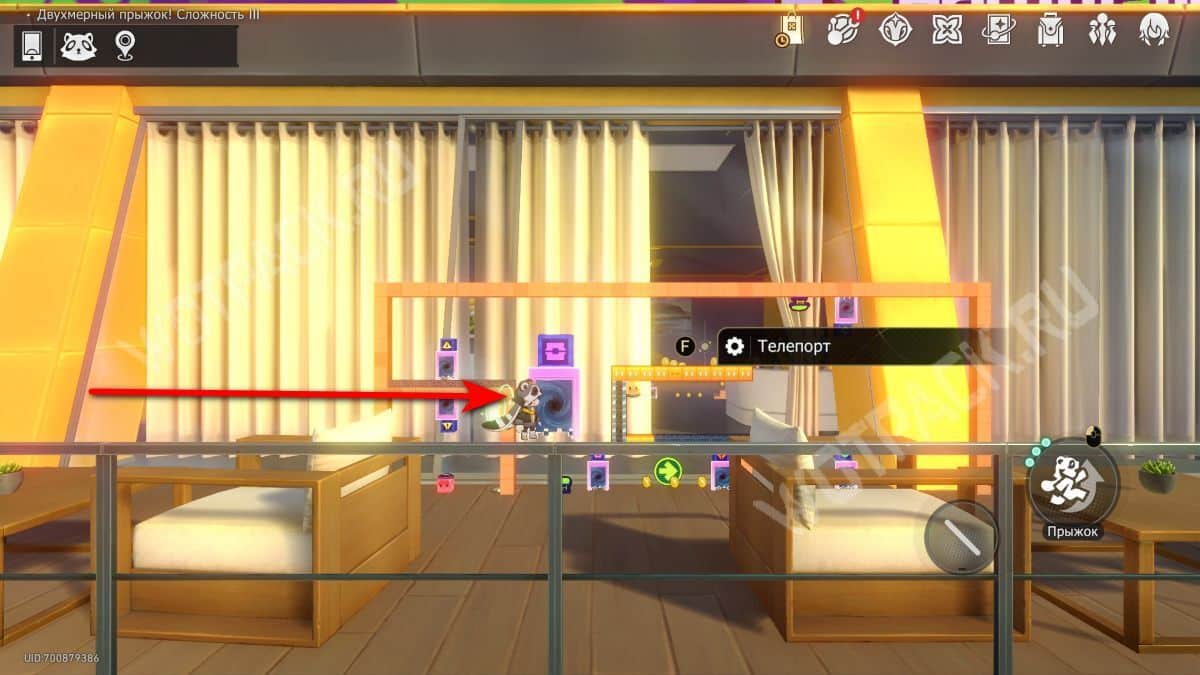 Далее находится заблокированный портал — откройте его с помощью кнопки рядом, до которой можно добраться с помощью батута. Перейдя по этому телепорту, поверните налево и снова переместитесь через врата с желтым значком.