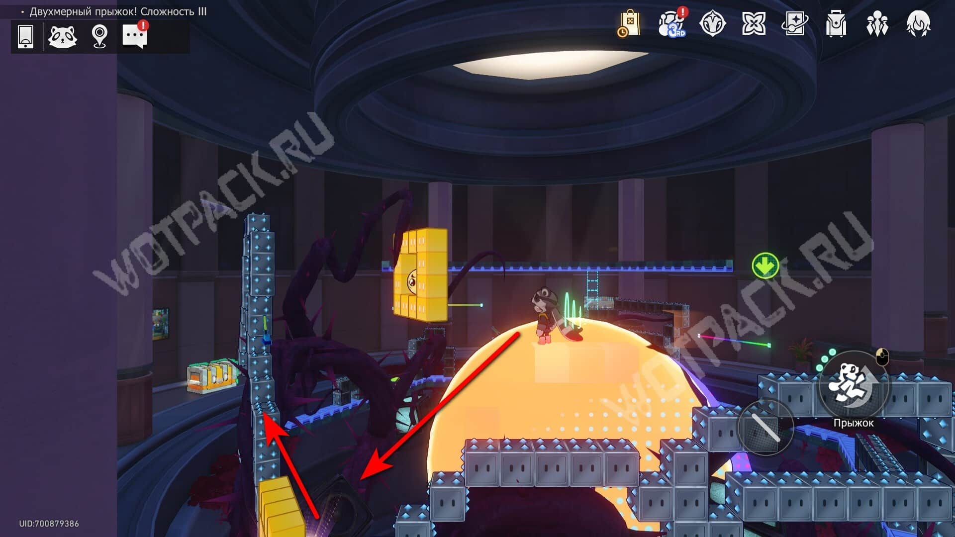 Дойдя до выхода из 2D мира, перепрыгните его и продолжайте движение по невидимым блокам, пока не увидите колонки.