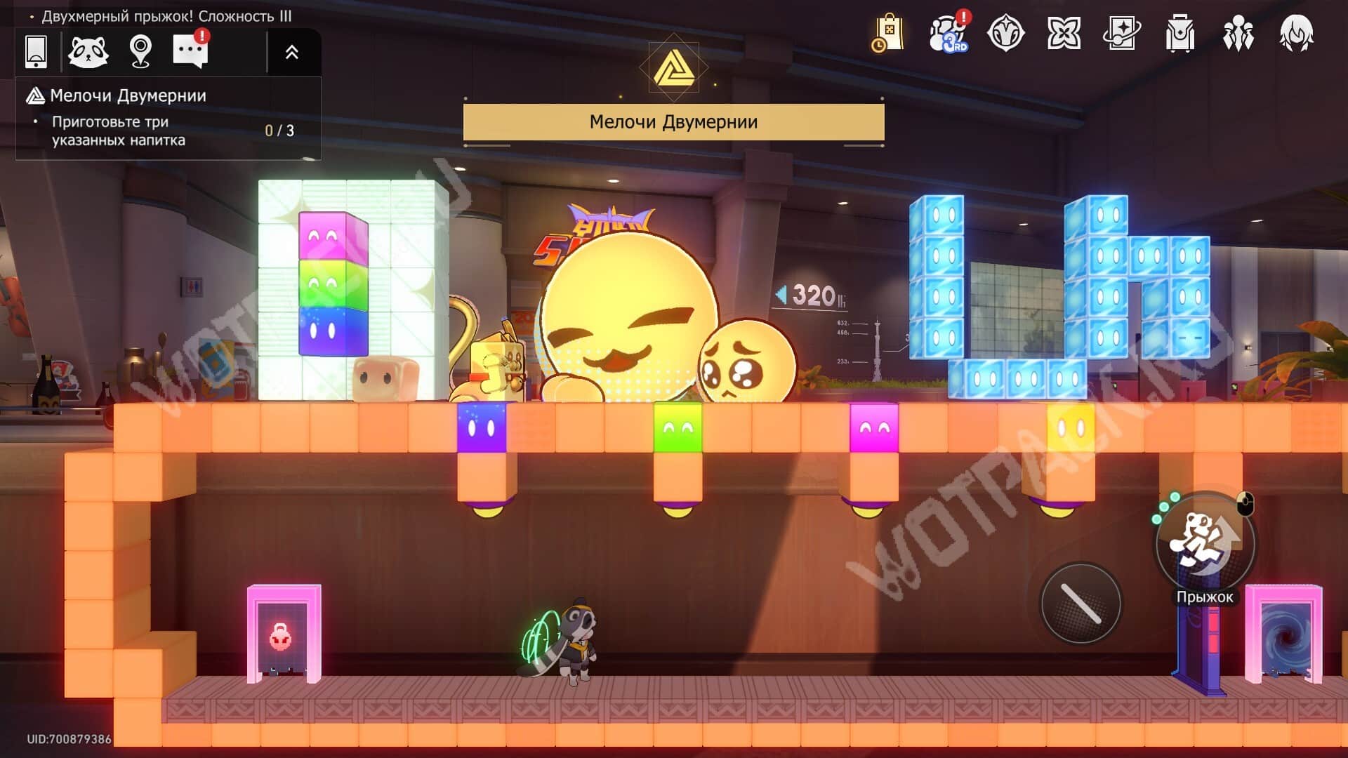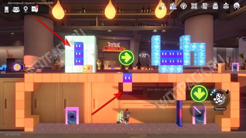 Двигайтесь вправо и «готовьте напитки» из кубиков эфемерами разных цветов, чтобы открыть дорогу дальше. Подсказки к тому, какой должен быть порядок в нажатии кнопок, указан около каждой головоломки.