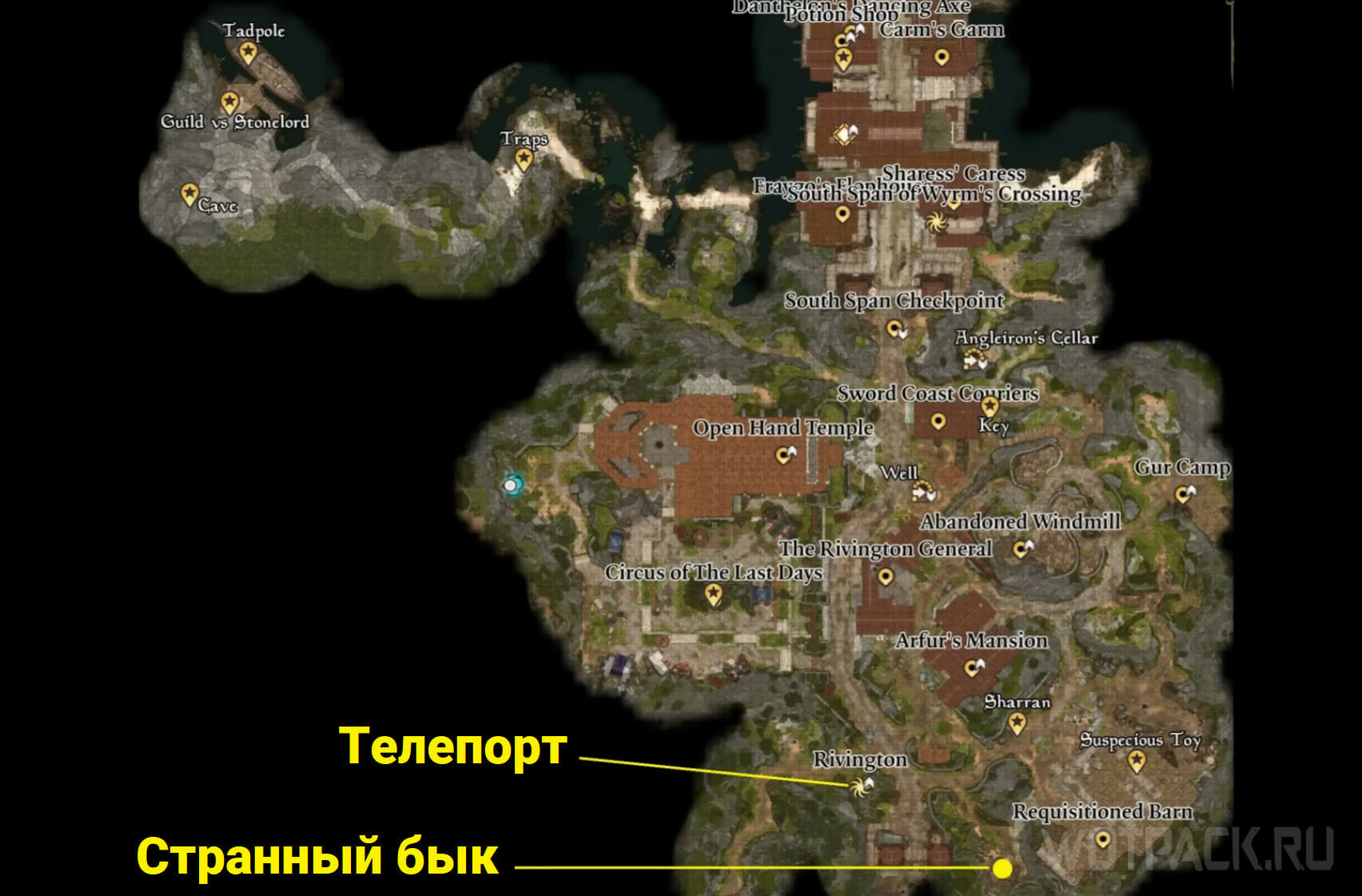 В 3 акте BG3 странный вол тоже есть. Чтобы найти его, отправляйтесь в Ривингтон, двигайтесь от телепорта на юго-восток и найдите небольшой амбар на возвышенности. Зайдите внутрь и увидите там единственное животное – странного вола.