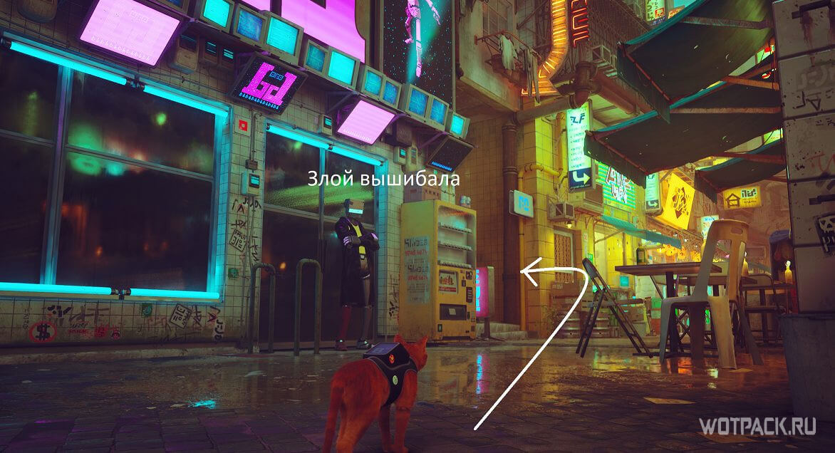 Теперь необходимо отправиться в ночной клуб Мидтауна, чтобы найти там девушку-Аутсайдера. От «хаба» города двигайтесь к месту, откуда пришли на локацию. Направление подскажет круглый неоновый знак с бутылкой внутри. У входа стоит вышибала, который, конечно же, не пустит котика внутрь.