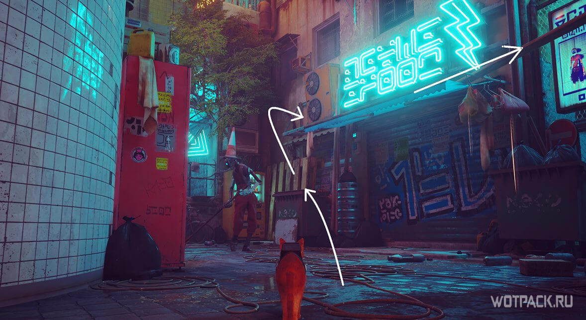 Направляйтесь в переулок справа от входа и двигайтесь вглубь. Немного левее стоит мусорный контейнер, с него можно забраться на навес, а оттуда пройти по трубам до открытого окна, откуда выглядывает Алекс. Мужчина очень рад пушистому другу и приглашает его войти внутрь и выпить чего-нибудь.
