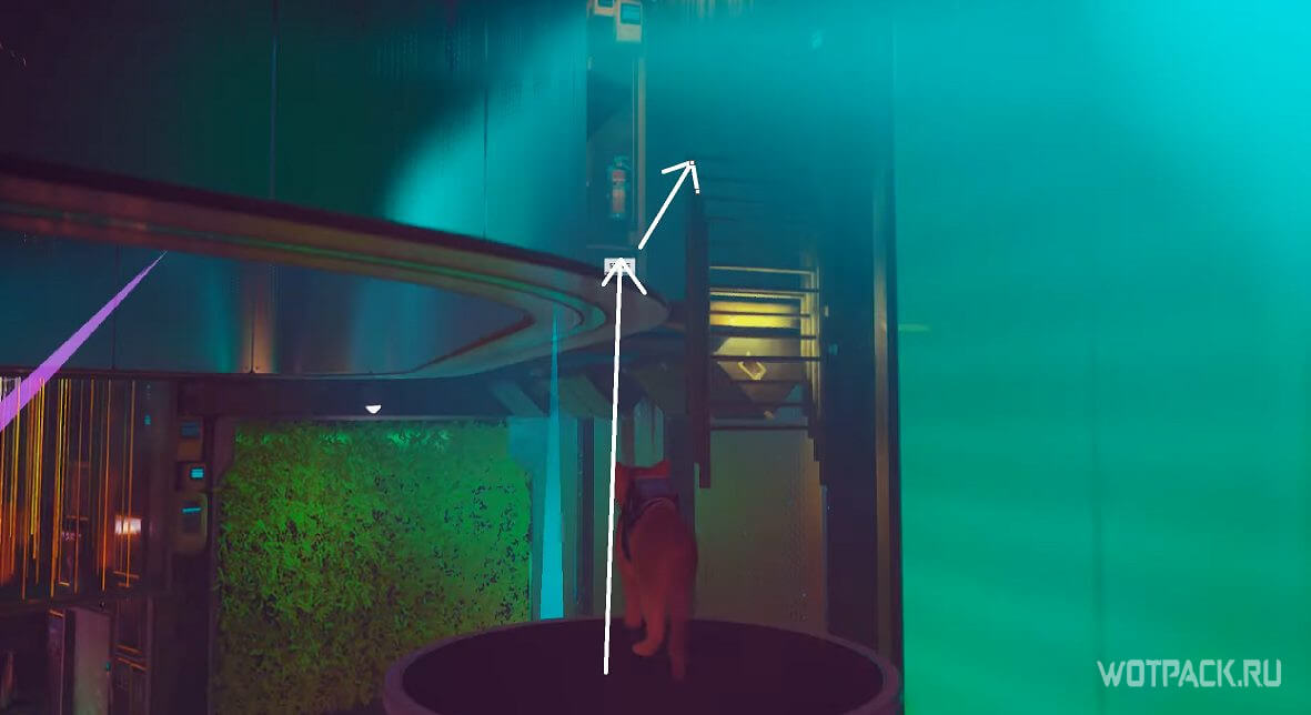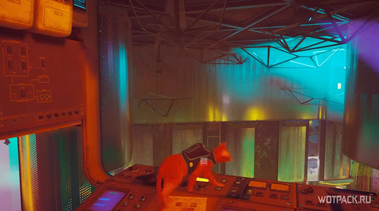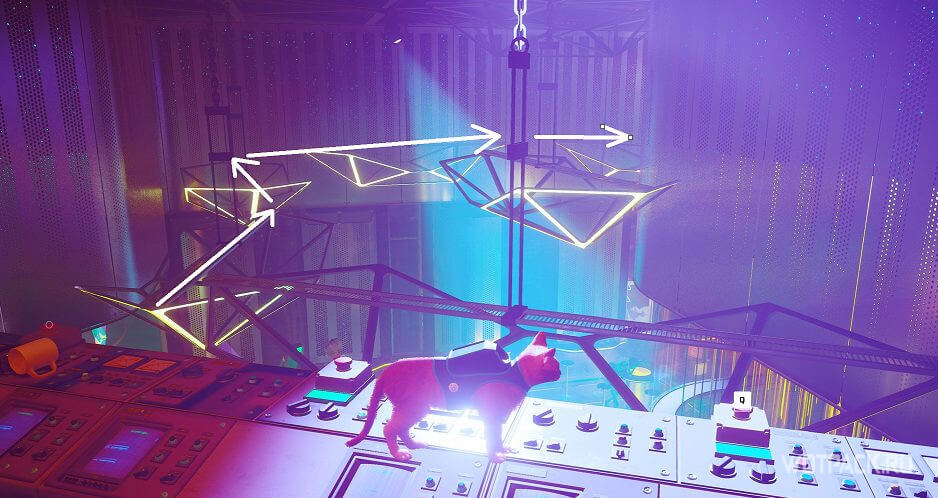 Взаимодействуйте с панелью управления лампами: сначала нажмите крайнюю правую кнопку, а затем крайнюю левую. Подвешенные конструкции выстроятся таким образом, чтобы котик смог добраться до VIP-балкона.