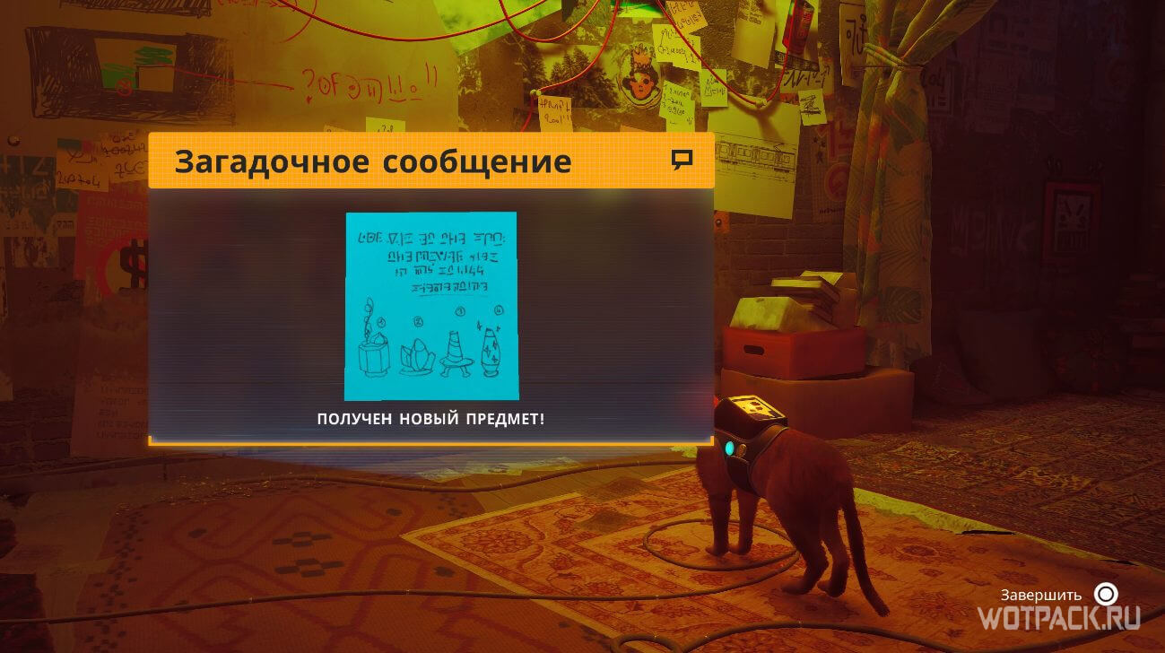 Оказавшись в квартире девушки-робота, сверните налево и зайдите в комнату с компьютером. Посмотрите на доску с подсказками и найдете там Загадочное сообщение для B-12 и котика.