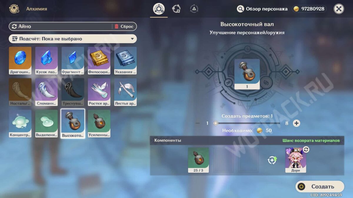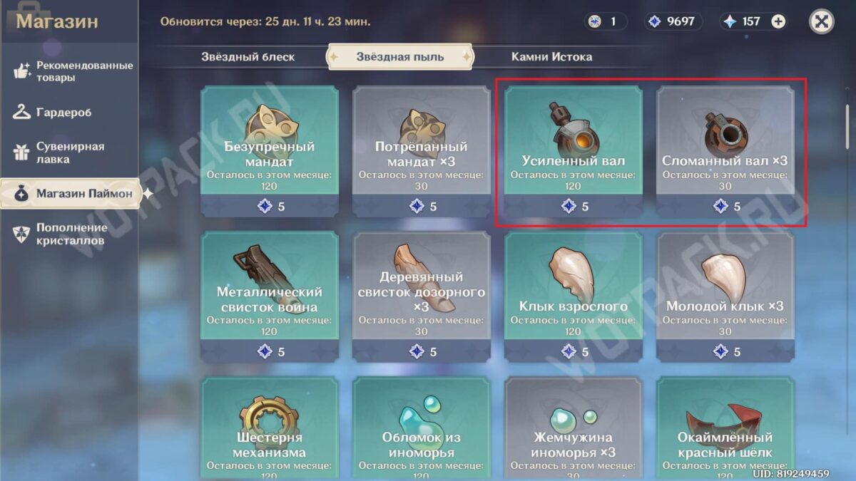Звездную пыль, полученную за крутки в молитвах, удастся обменять на ограниченное количество компонентов в магазине Паймон. Кликните по вкладке «Звездная пыль» или «Звездный блеск», чтобы приобрести материалы и пополнить запасы запчастей.