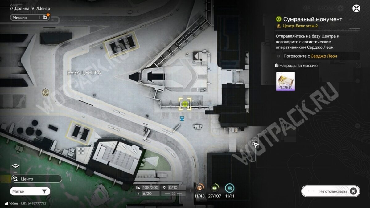 После этого найдите в журнале миссию «Сумрачный монумент» и отправляйтесь на Базу Центра, чтобы пообщаться с Серджо Леоном.