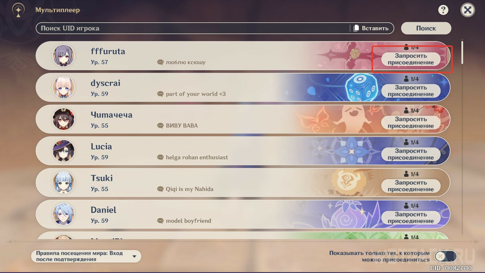 Просить помощи можно у игрока с любым прогрессом изучения Тейвата, поскольку озеро доступно независимо от сделанных квестов или открытых локаций. Учитывайте, что мультиплеер открывается только с 16 ранга приключений. Игроки могут заходить в чужой мир только при условии, что второй игрок имеет тот же уровень мира или ниже, и его аккаунт находится на том же сервере.