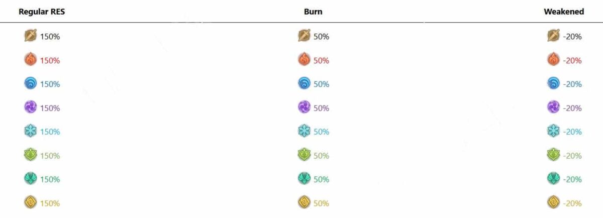 Изначально противник имеет повышенные резисты ко всем элементам, равные 150%. После нанесения определенного количества Пиро ударов, он начинает постепенно перегреваться. При достижении шкалой перегрева половины, его сопротивления падают до 50%, а сам он закрывается Крио щитом, который нужно снять за 18 сек. Если это вовремя сделать, его резисты уменьшатся до -20%, а сам он потеряет 30% HP.