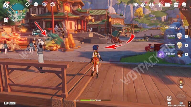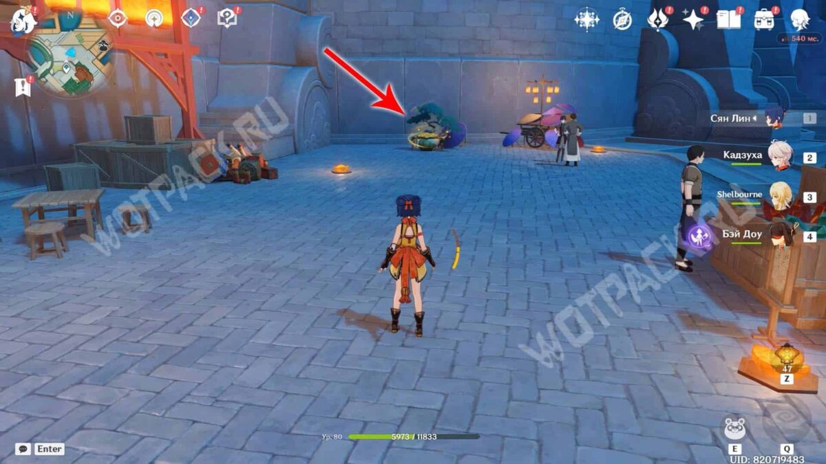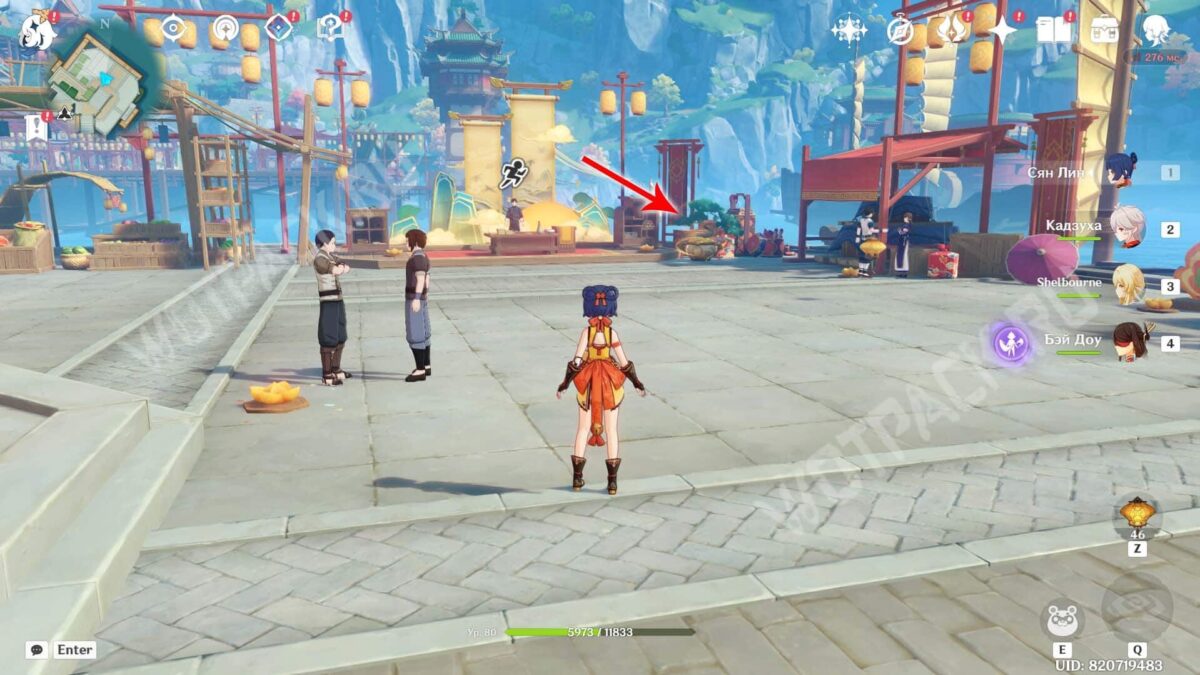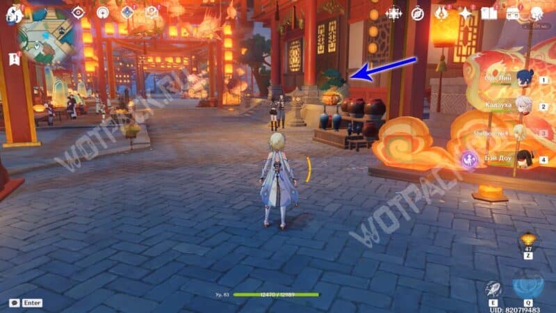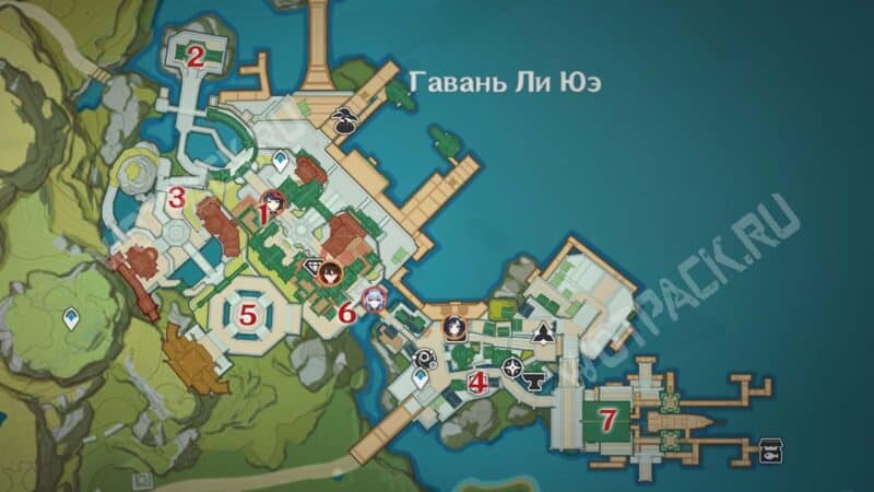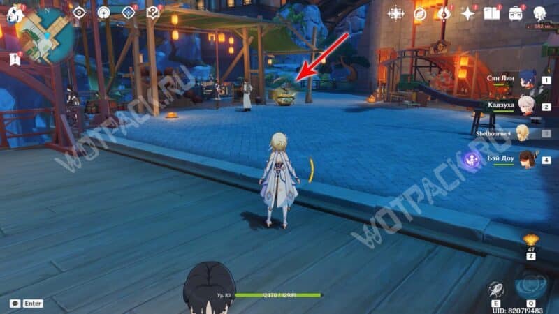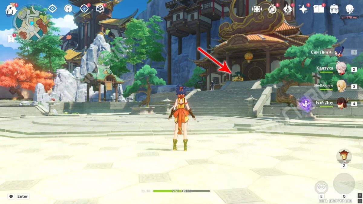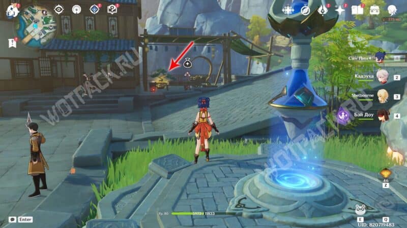 Пройдите через мост к ювелирному дому «Минсин» и развернитесь в сторону шатра «Синьюэ» — у колонны расположился искомый предмет.
