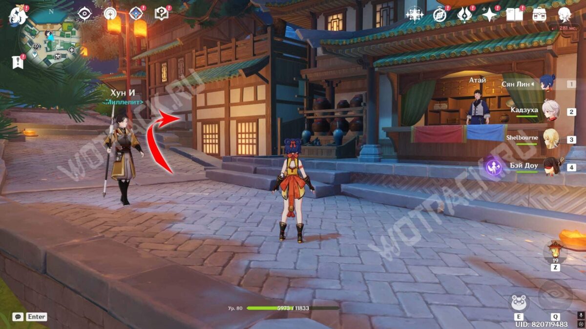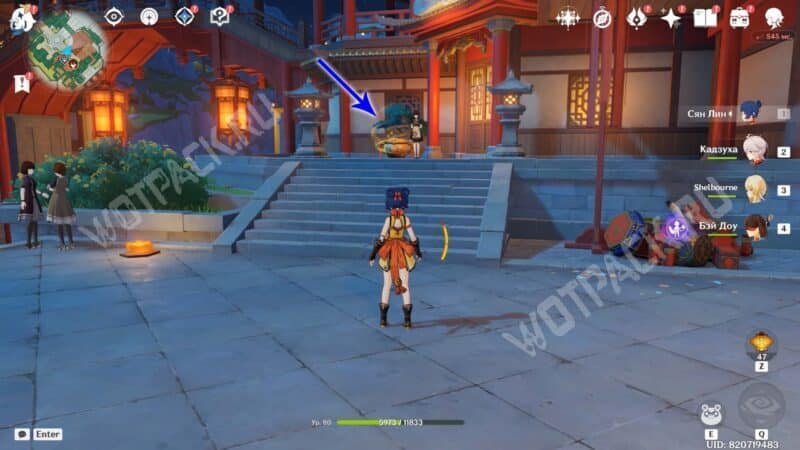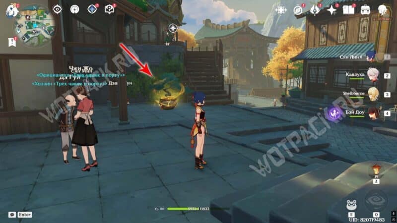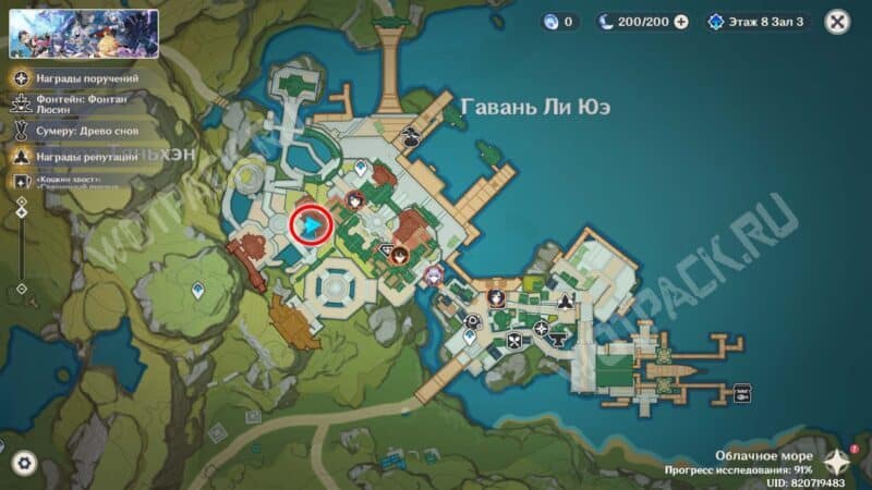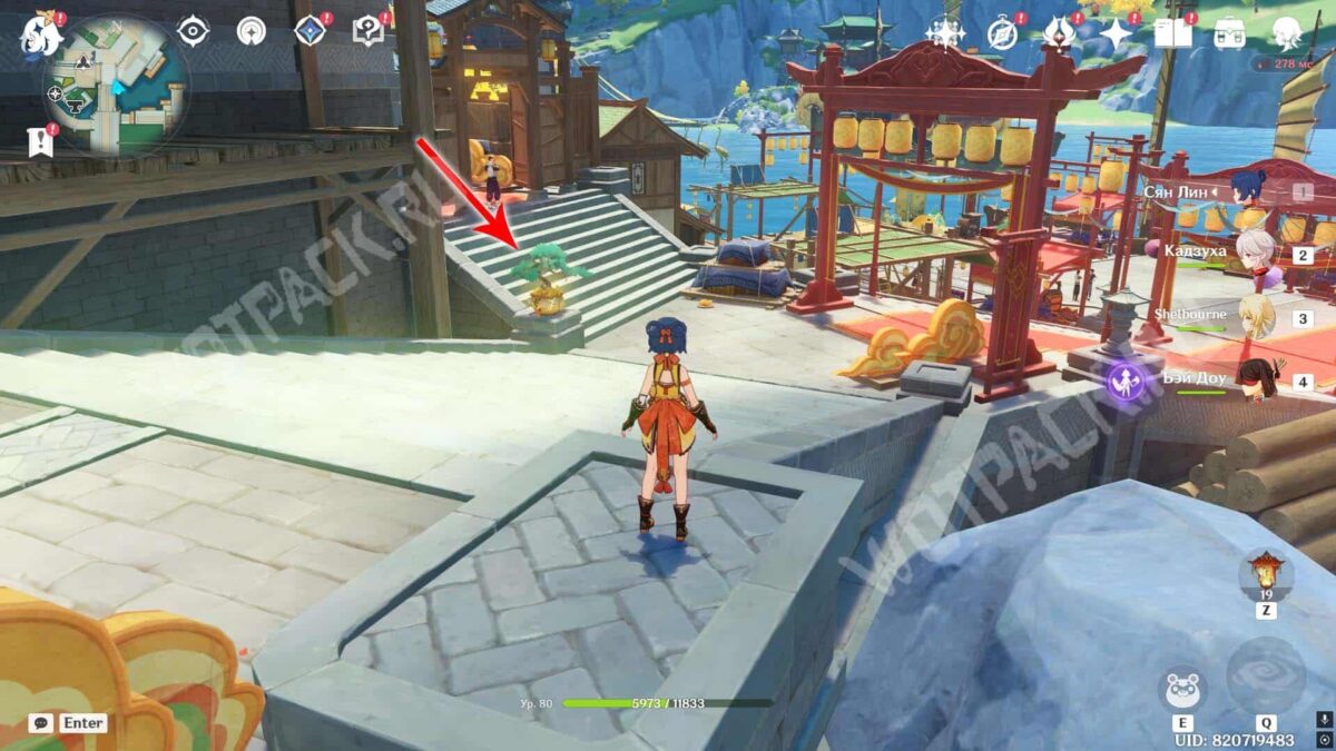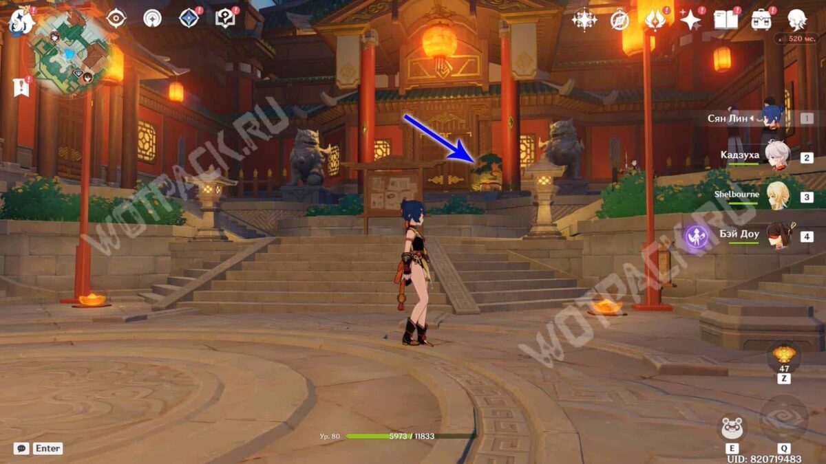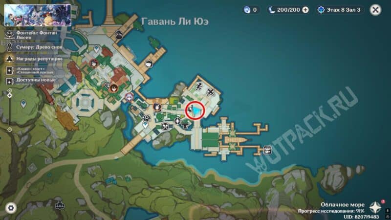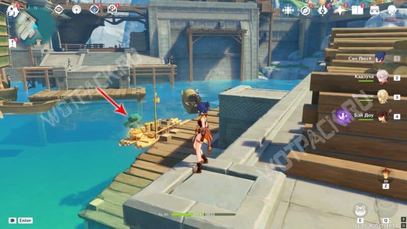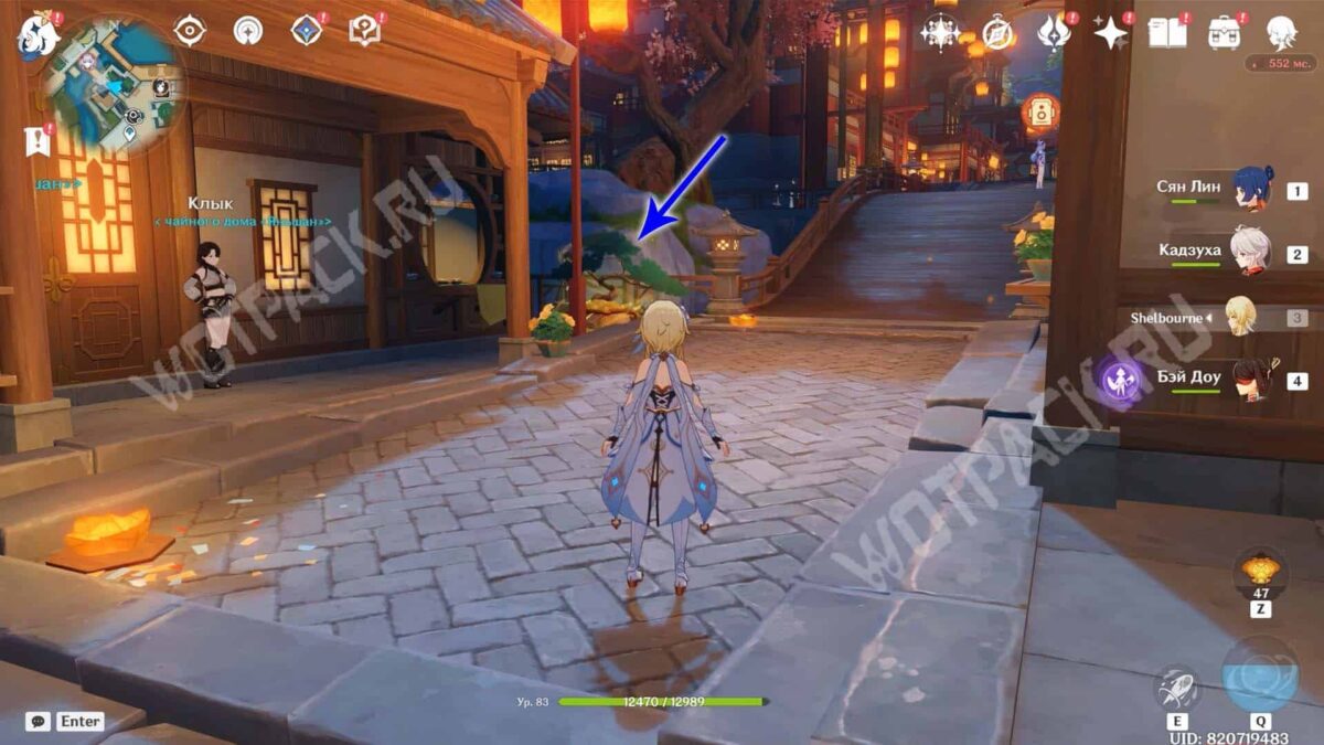 Пройдите через мост к ювелирному дому «Минсин» и развернитесь в сторону шатра «Синьюэ» — у колонны расположился искомый предмет.