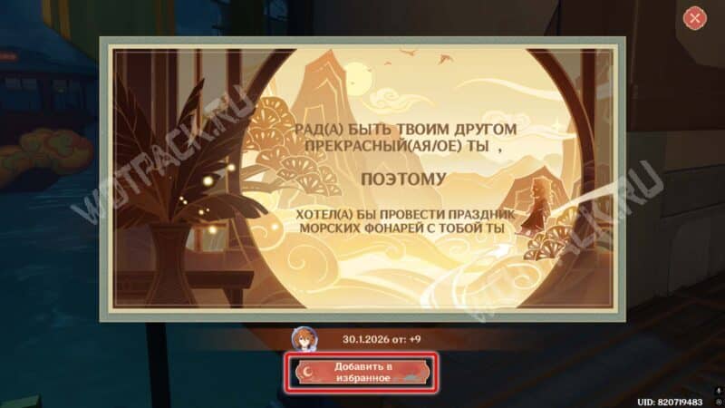 Появится яркая открытка, которую при желании можно добавить в избранное и позже пересмотреть в разделе «Пожелания фонарей» на карте события. Для выполнения миссии потребуется прочитать десять поздравлений от других игроков.
