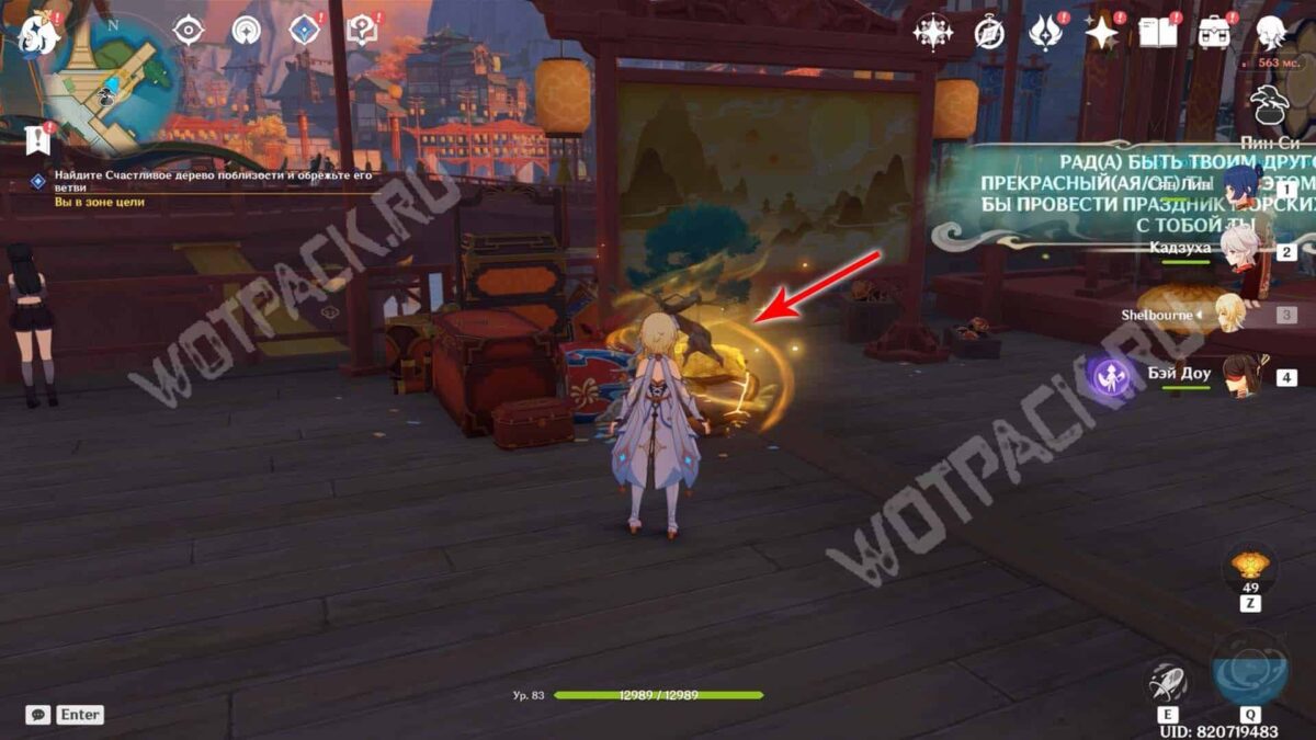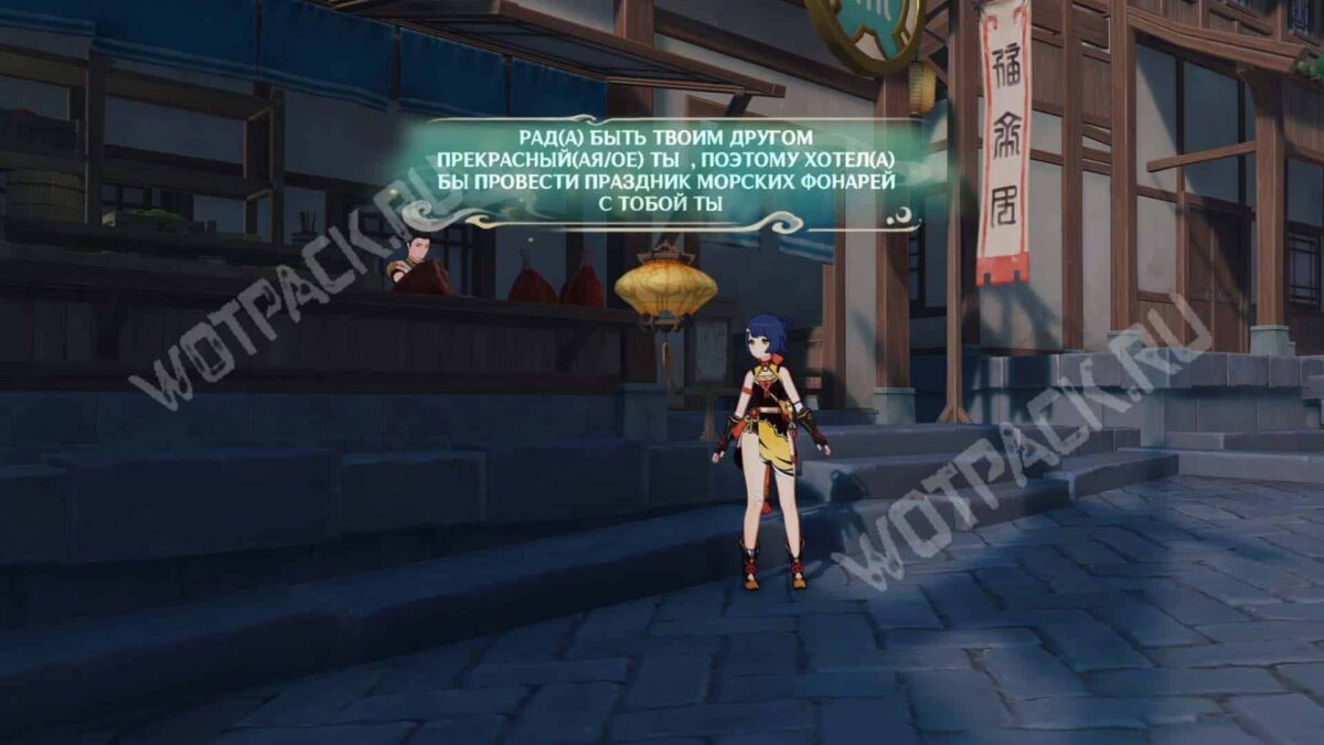 Нажав на иконку, убедитесь, что персонаж относится к активности «Волшебные фонарики», и встретьтесь с ним в обозначенной точке. Вместе подготовьте яркую открытку и прочитайте ее в небесном фонарике, чтобы действие засчиталось. Помимо теплых поздравлений, спутник оставит небольшой подарок — особое блюдо.