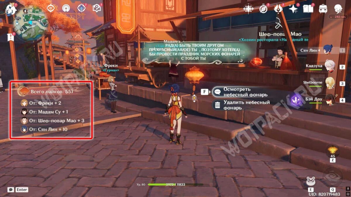Накопить достаточное количество сердец получится с помощью парящих фонариков. Выпускайте их в гавани Ли Юэ: так другие игроки или НПС смогут получить поздравление и автоматически поставят лайк после просмотра открытки.