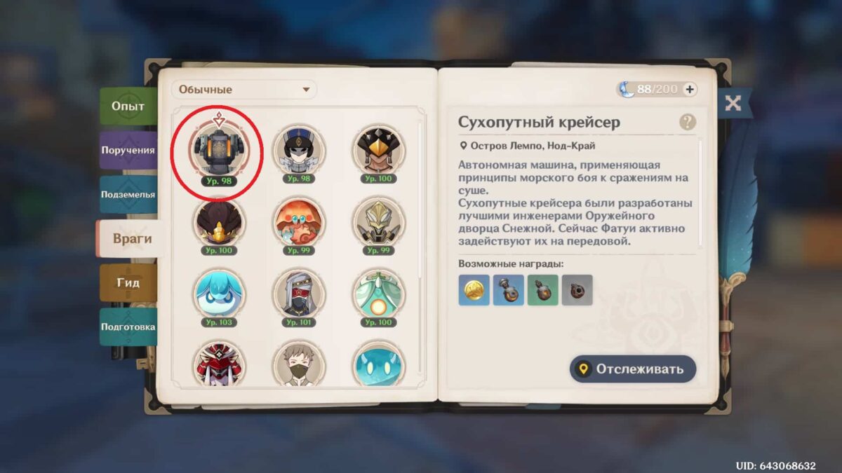 - Сломанный/усиленный/высокоточный вал можно получить после победы над боевыми машинами Фатуи — сухопутными крейсерами. Лучший маршрут для сбора пролегает по острову Паха.
