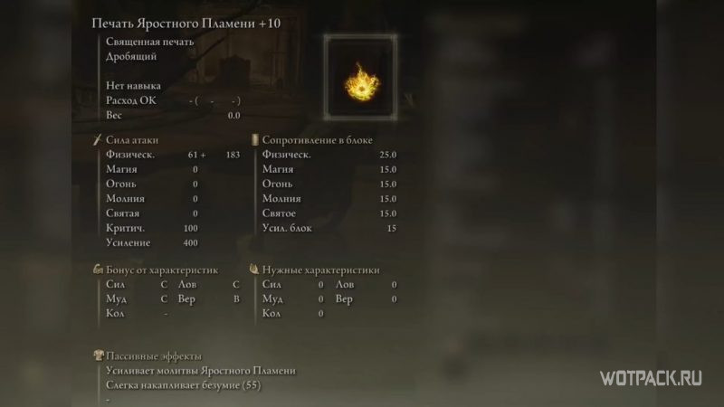- Атака: физ. урон – 25, святой урон – 15, крит. урон – 100, усиление – 60